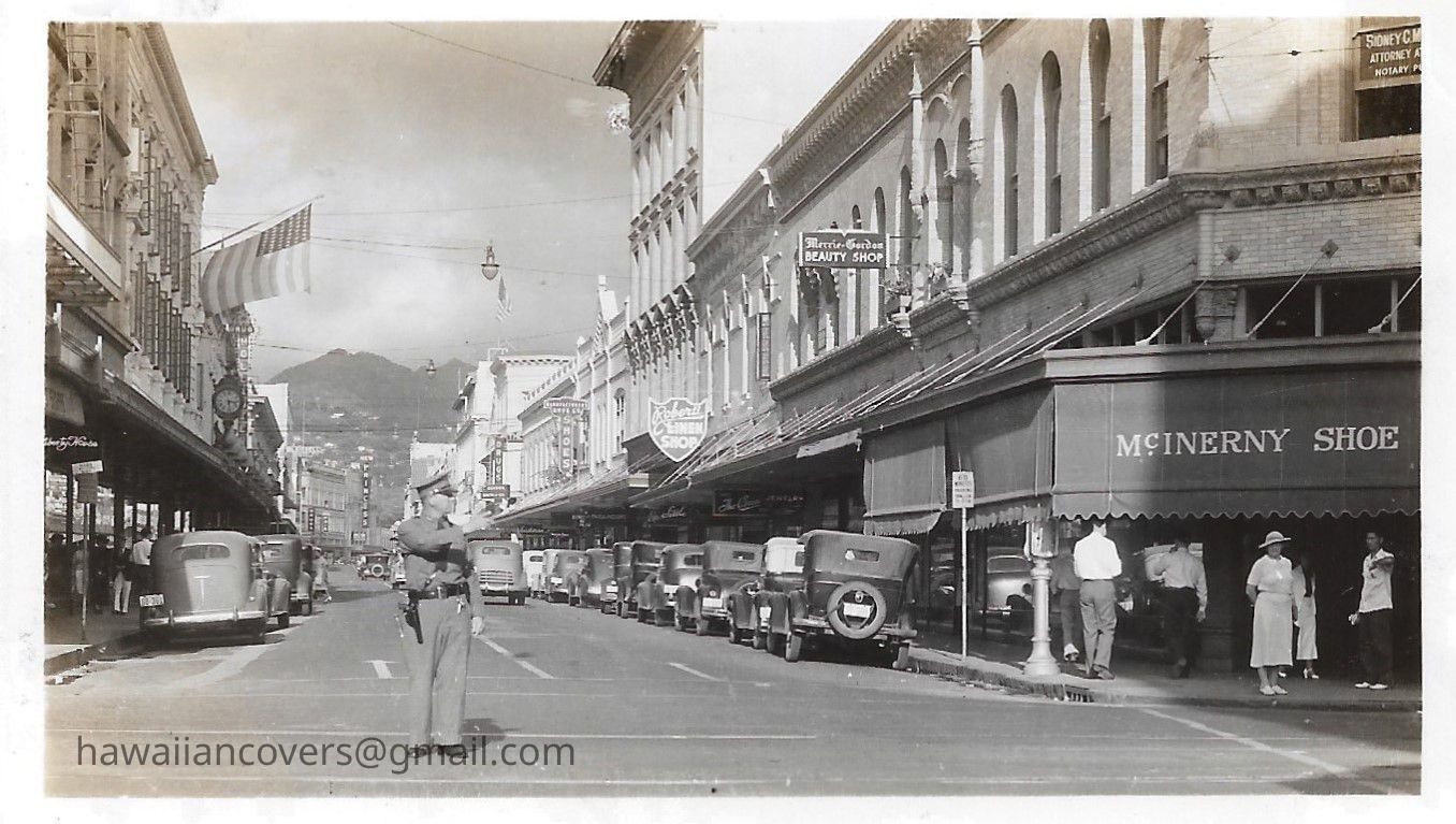 Sharp View of downtown Honolulu with McInerny Shoe store in the forefront. Fort St from King St.Created By
