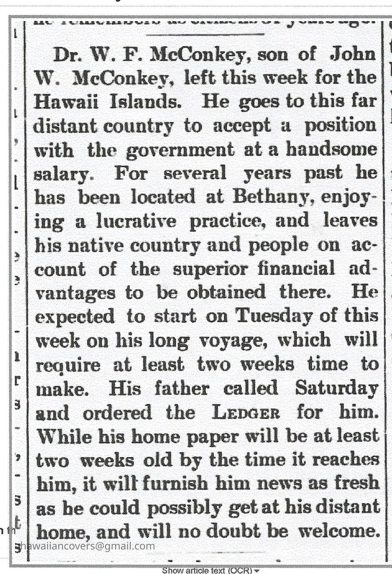 Dr. W. F. McConkey had established in 1909 to provide services to indigent tuberculosis patients. Placed at the apex of a hill at the 3,500-foot elevation, the new building allowed patients access to fresh country air and sunshine. The rooms' screened lanai allowed patient beds to be rolled directly outside and solariums were located at the ends of each floor. Tuberculosis had been the leading cause of death in Hawaii in 1909.Created By