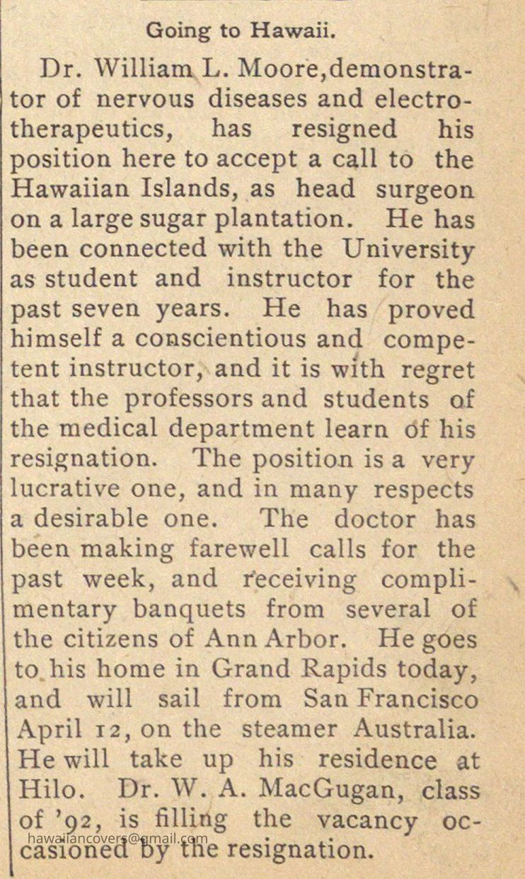 Dr. William L. Moore, demonstrator of nervous diseases and electrotherapeutics, has resigned his position here to accept a cali to the Hawaiian Islands, as head surgeon on a large sugar plantation. (Ann Abor Argus Newspaper, March 31, 1893)