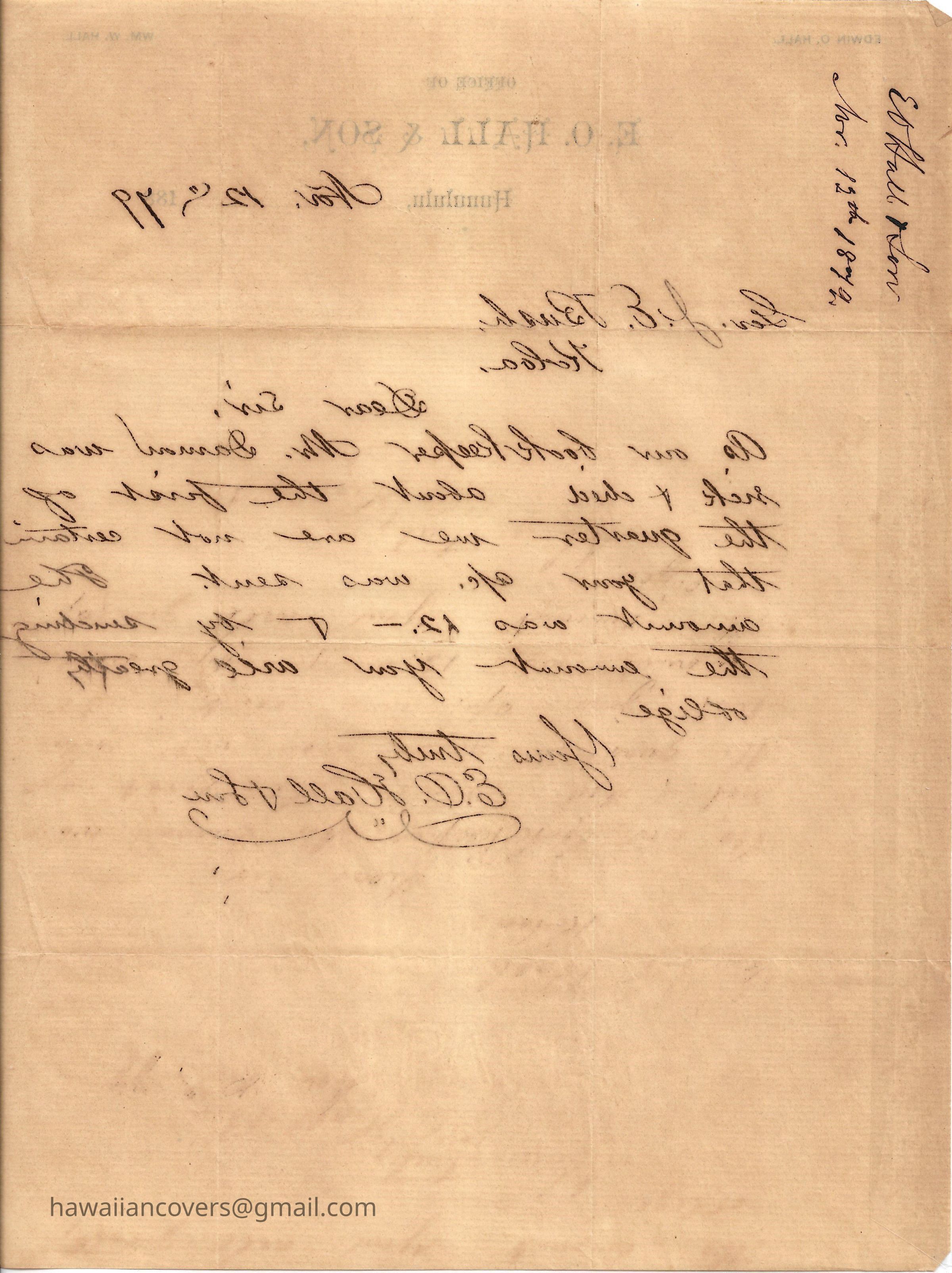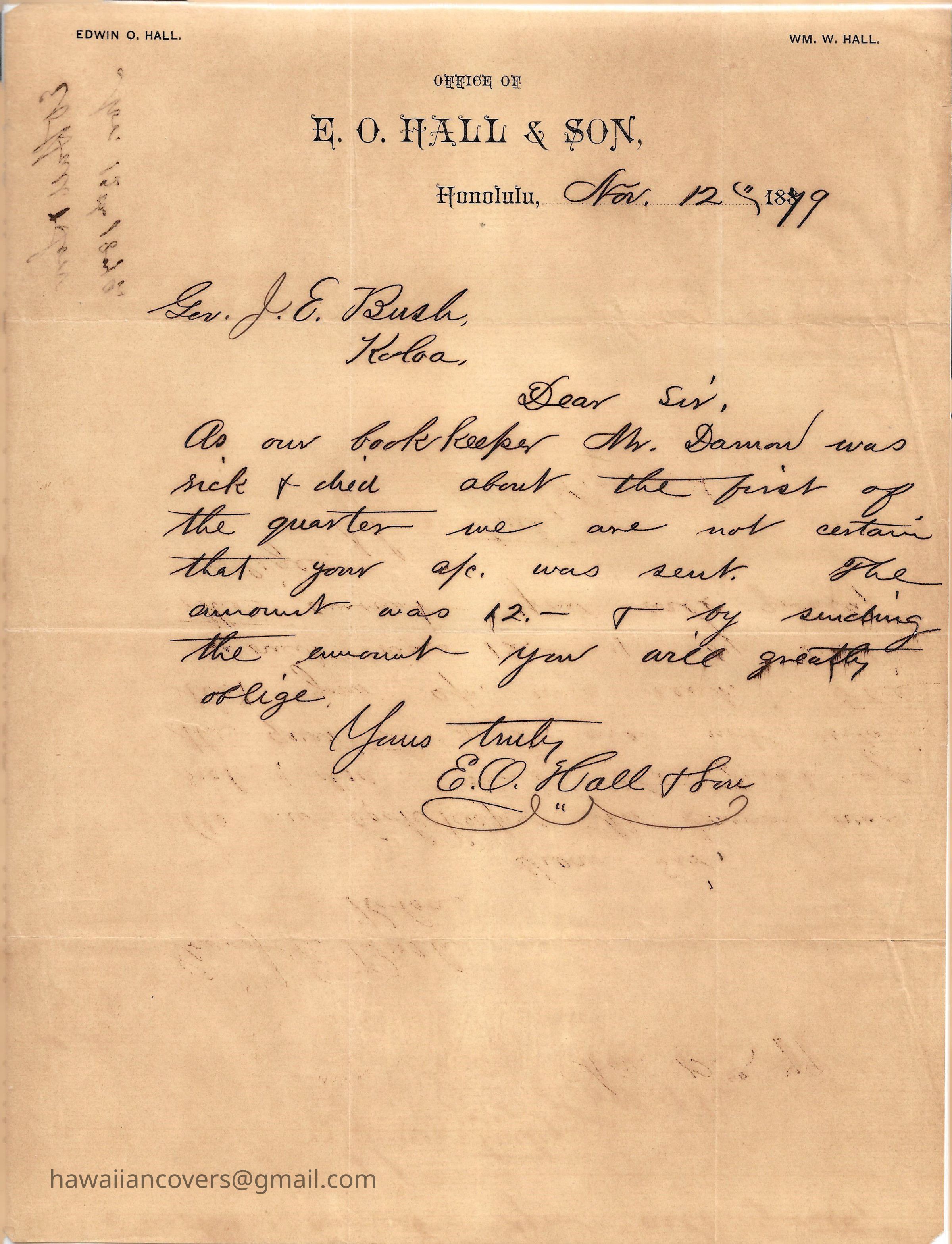 In 1873, Hall was appointed Minister of the Interior by King Lunalilo. Upon Lunalilo's death, King Kalākaua formed his own cabinet, and Hall was replaced by Hermann A. Widemann on February 17, 1874.[6]Edwin Oscar Hall (1810–1883) was a businessman who was appointed Minister of Finance by Kamehameha III, serving in that capacity for one year. He was subsequently appointed Minister of the Interior of the Kingdom of Hawaii on January 10, 1873, by King Lunalilo. After Lunalilo's death, he remained in the position until Kalākaua replaced him on February 17, 1874, with Hermann A. Widemann.