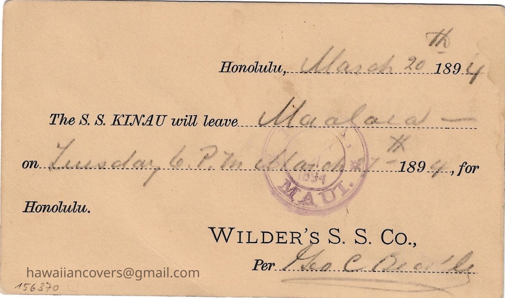 "The S.S. Kinau will leave Maalaea on Tuesday 6, P.M. March 27th 1894, for Honolulu.