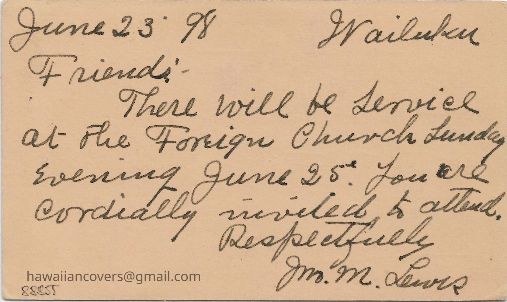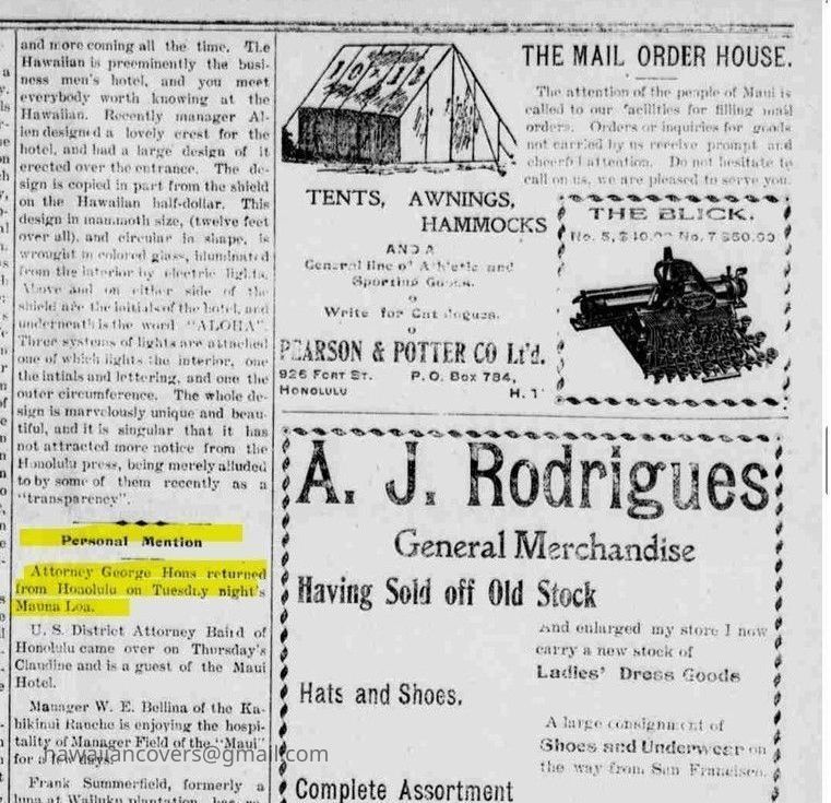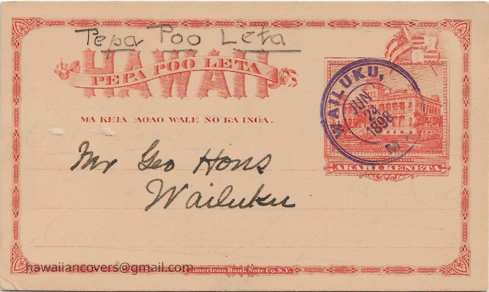 Postal card addressed to Mr. George Hons, postmarked Wailuku, June 24, 1898.