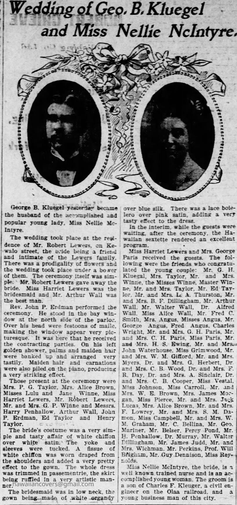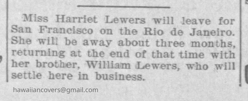 When Harriet Layman Lewers was born on 26 December 1869, in Honolulu, Oahu, Hawaii, United States, her father, Robert Lewers, was 33 and her mother, Catharine Rebecca Carter, was 25. She married Arthur Frederick Wall on 28 October 1901, in Honolulu, Oahu, Hawaii, United States. They were the parents of at least 1 son and 1 daughter. She immigrated to Hawaii, United States in 1900 and lived in Koolaupoko, Oahu, Hawaii, United States in 1930 and Representative District 4, Honolulu, Hawaii, United States in 1940. She died in 1943, at the age of 74.