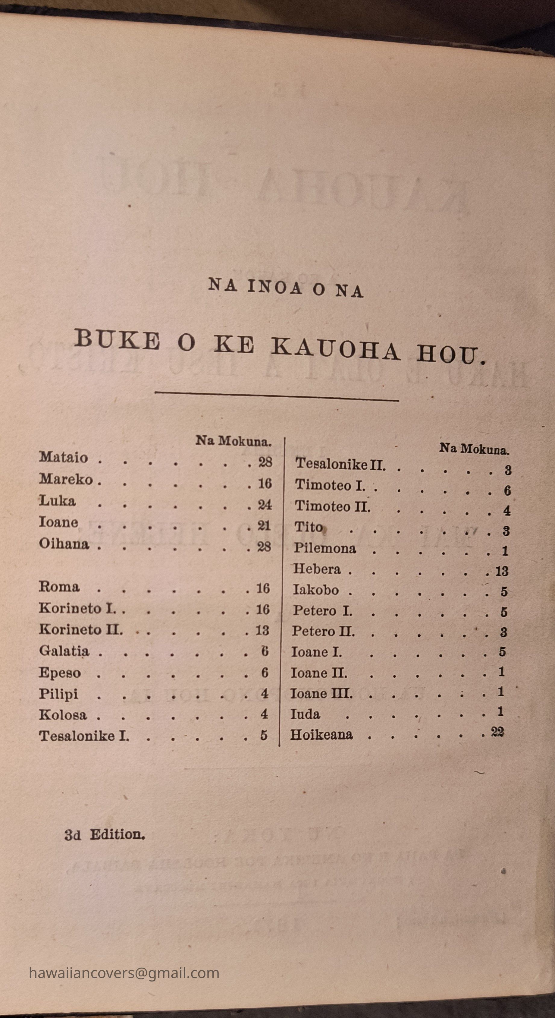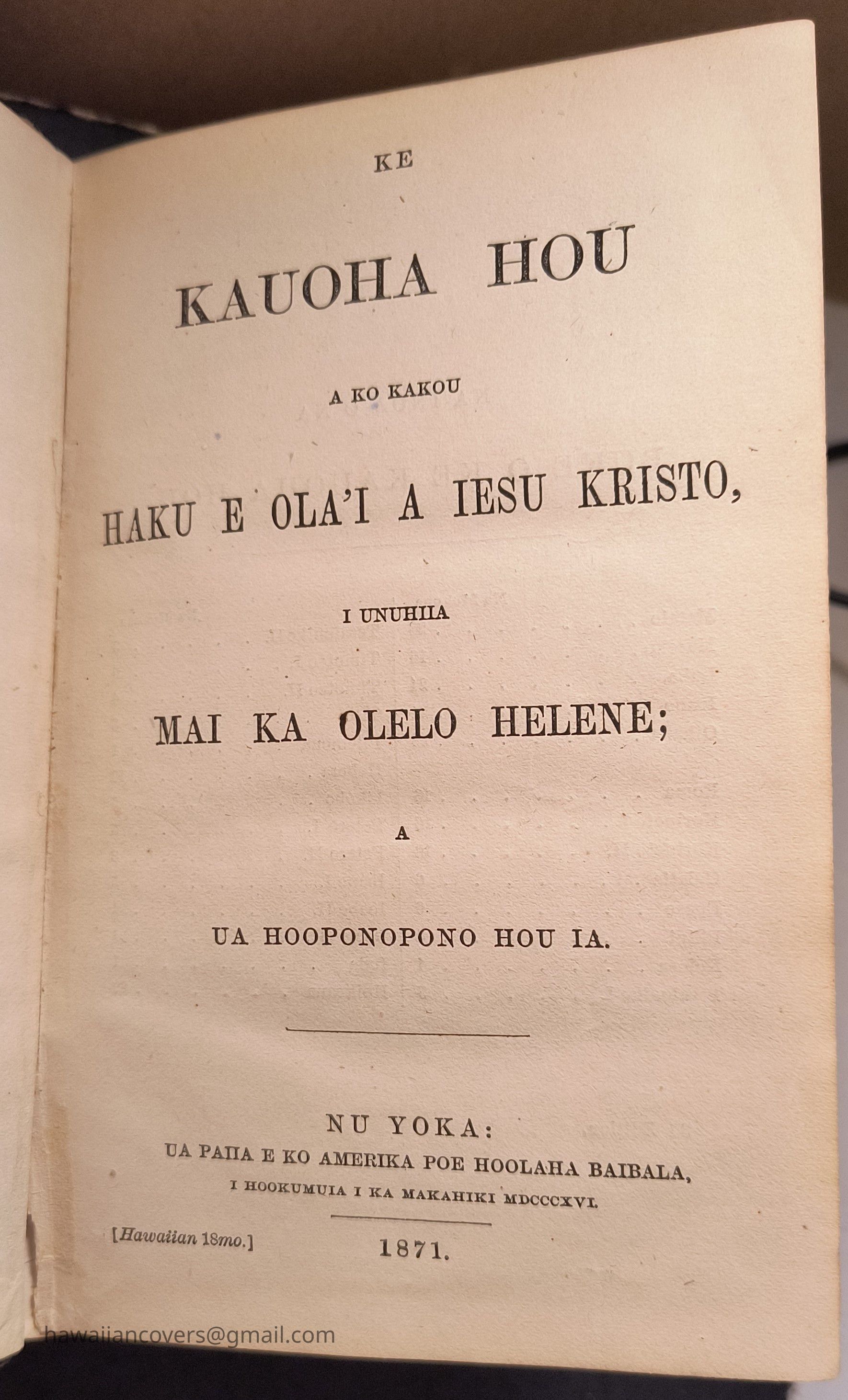 Ke Kauoha Hou A Ko Kakou Haku E Ola’I A Iesu Kristo, I Unuhia Mai Ka Olelo Helene; A Ua Hooponopono Hou Ia. Or the New Testament in Hawaiian published 1871. (3rd Edition).
