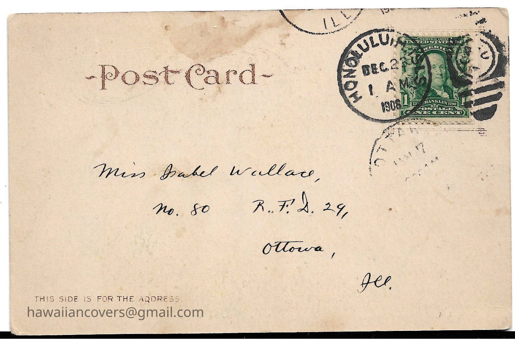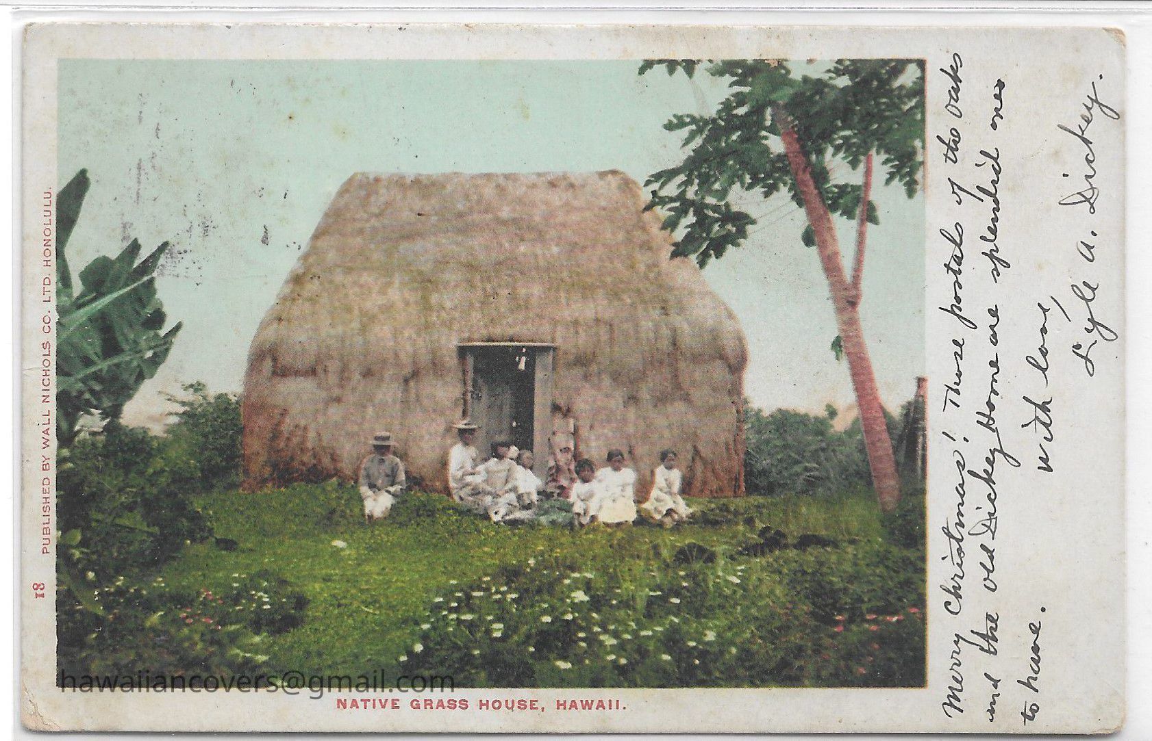 Inscribed "Native Grass House, Hawaii". Postcard cancellation date December 23, 1908