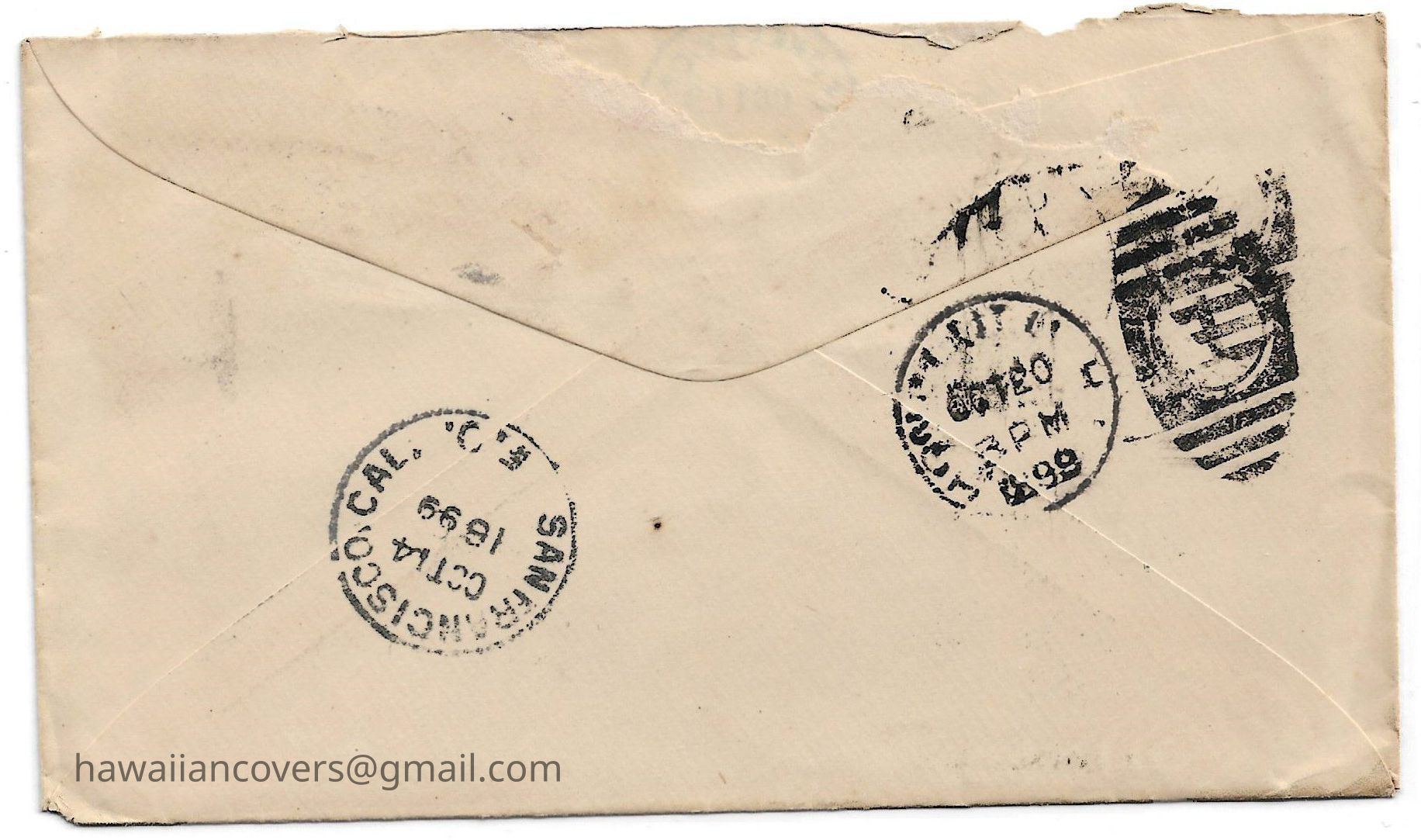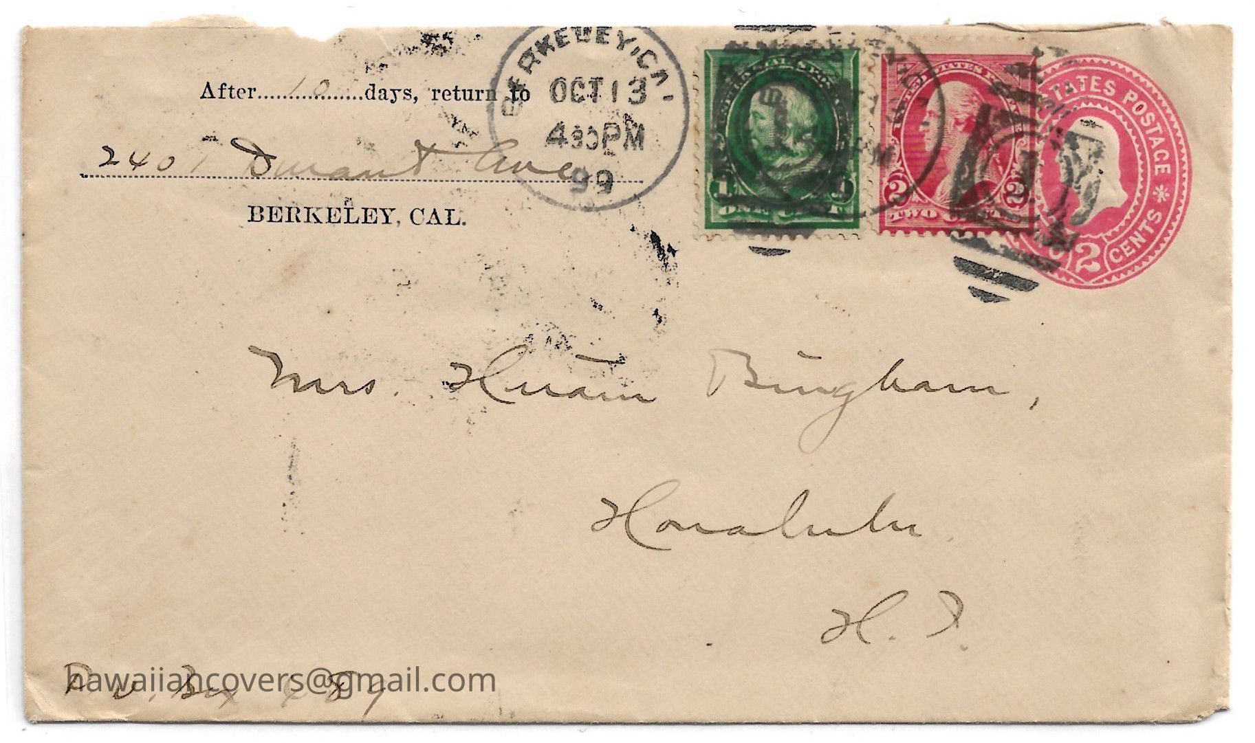 Author believes cover was sent by Hiram Bingham III, from Berkeley, CA, cancelled date Oct 13, 1899 to Mrs. Hiram Bingham (his mother), Honolulu H.I.