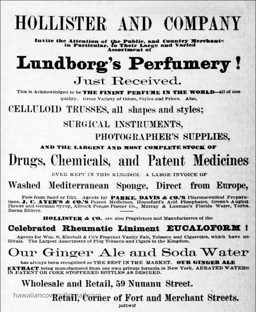 Hollister remained in business until the spring of 1878 when his father died. In December of that year, Hollister’s son-in-law H. A. Parmalee and his family arrived in Honolulu from the States. They formed a copartnership to carry on the soda water and tobacco business shortly afterward, adding drugs to their other lines when they opened a drug store in 1880.