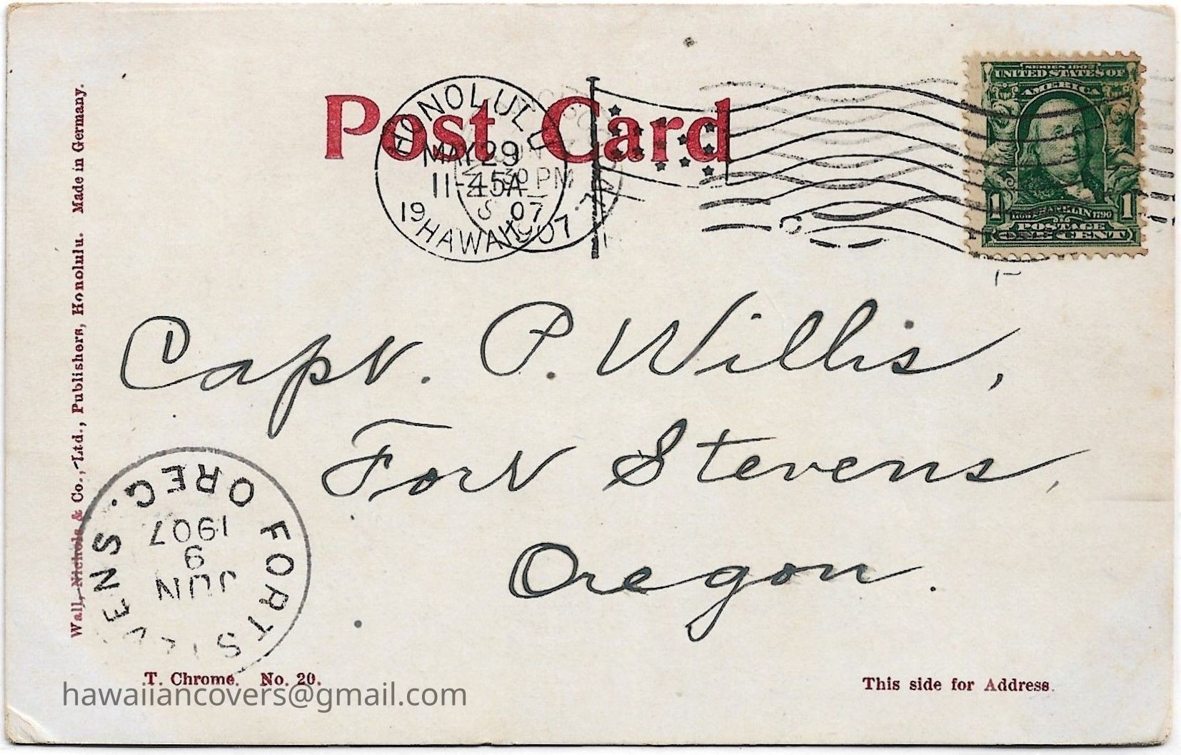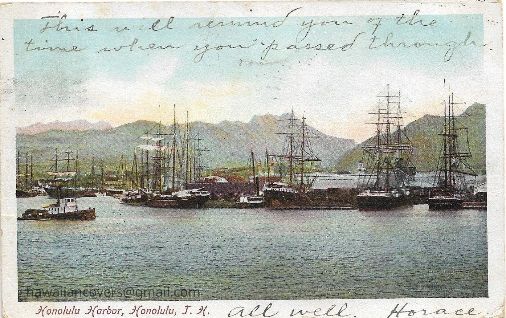 Inscribed "Honolulu Harbor, Honolulu, T.H." Honolulu postmarked May 29, 1907.