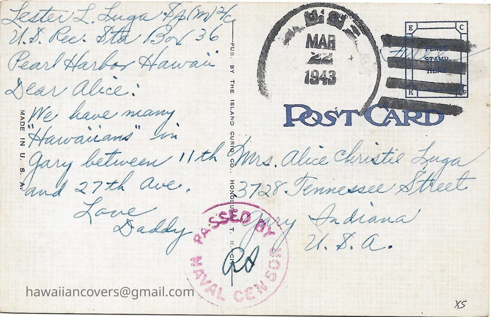 Postal Card sent from Pearl Harbor Hawaii, postmarked March 22, 1943, during war time.