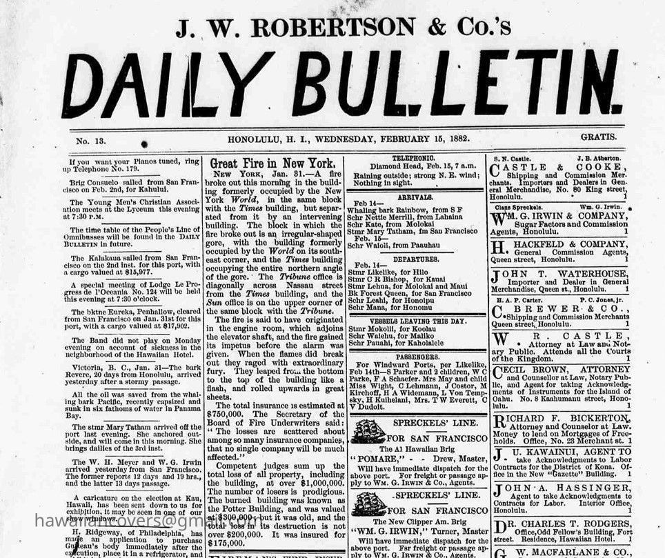 In 1882, he started "Daily Bulletin", which afterward became the "Evening Bulletin", and finally merged with the Hawaii Star, as the Star Bulletin. In 1886 he entered the customs and remained in government service until the reign of Liliuokalani when he became chamberlain, retiring with the Queen in 1893.