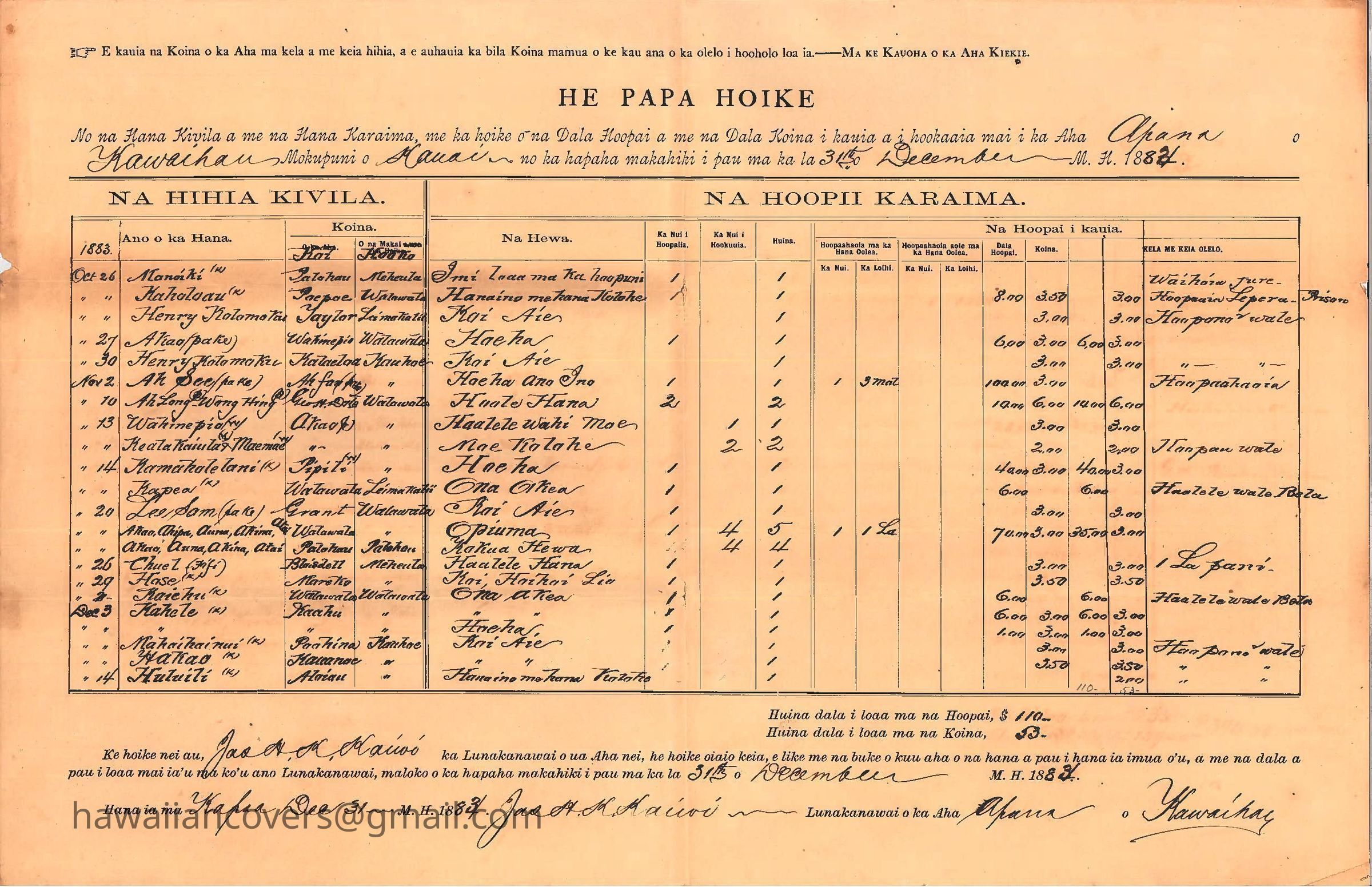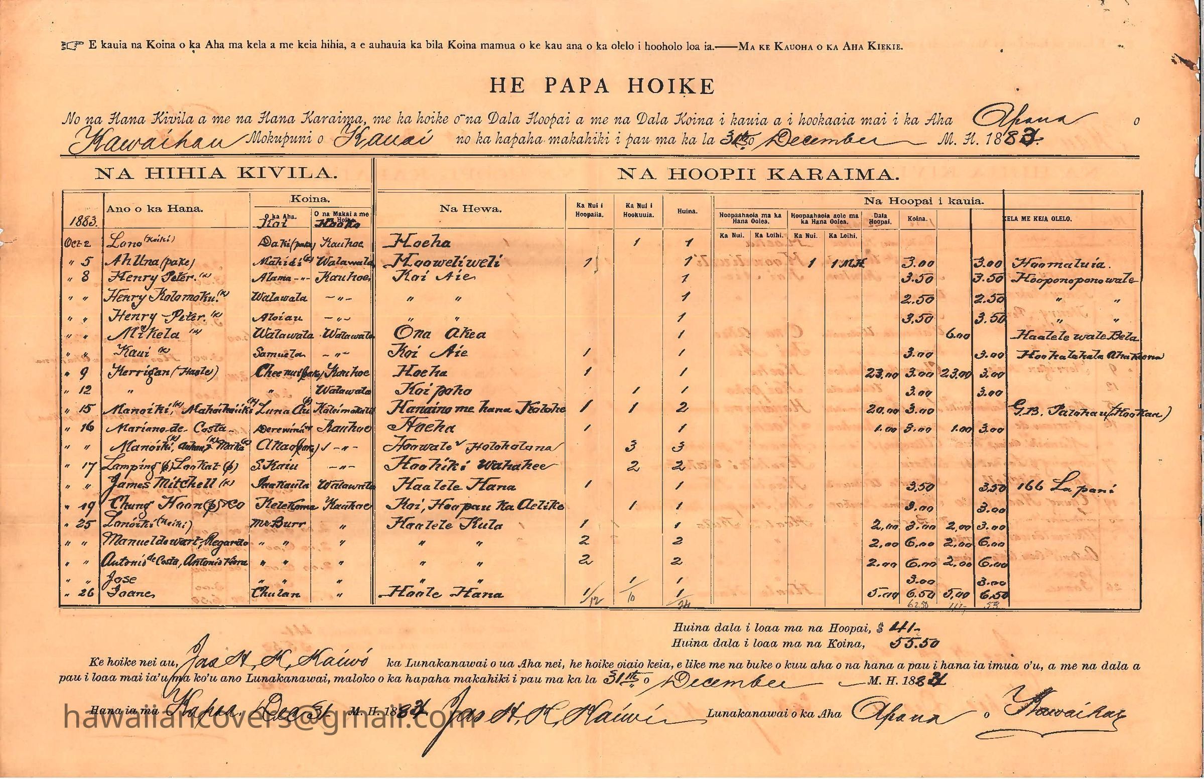 Court Records of Judge James H K Kaiwi, from Kawaihau District of Kauai. Per document, there had to be at least 60 entries for submission. Records start from October 2, 1883 to December 31, 1883.