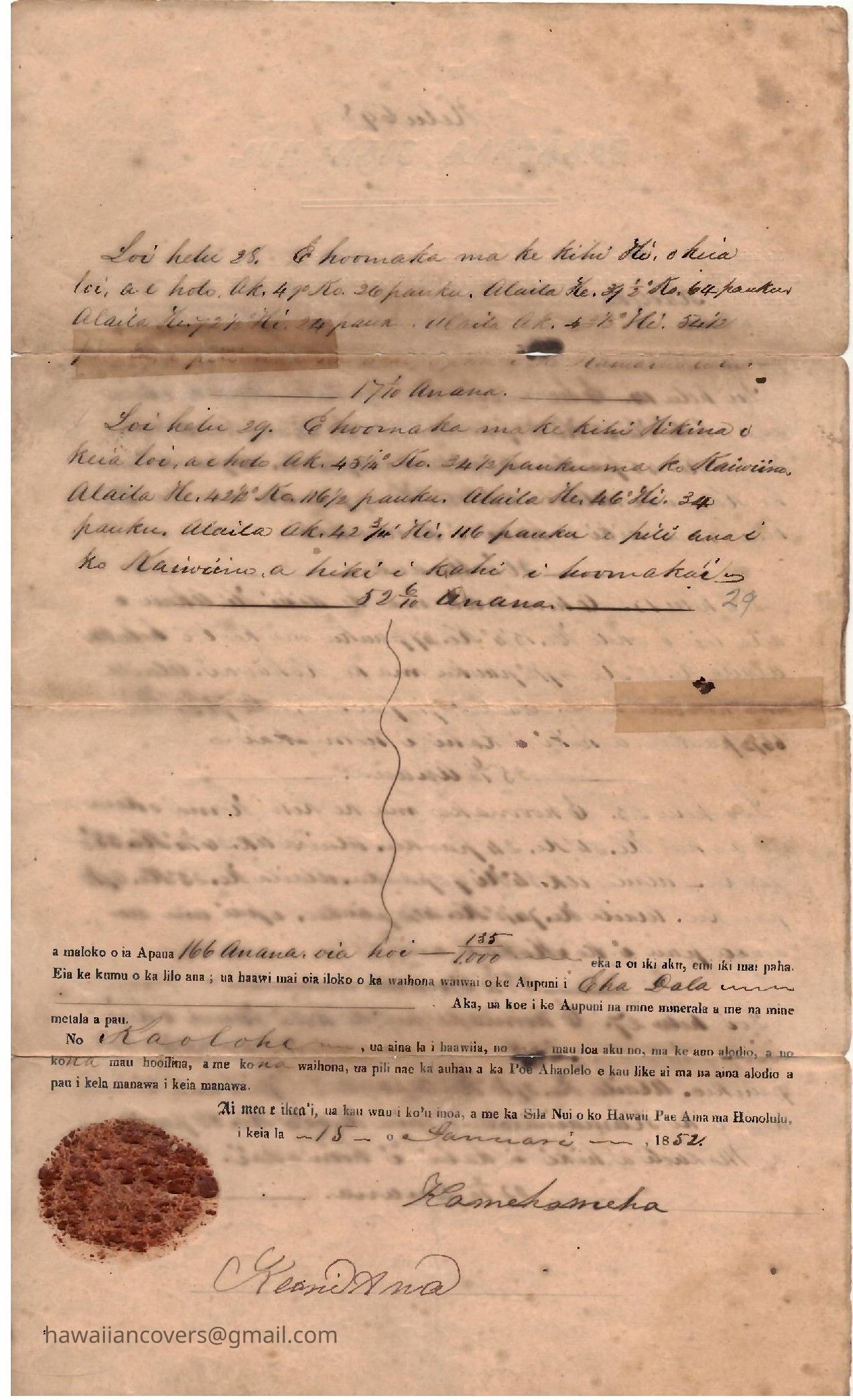 Hawaii, Kamehameha III, signature "Kamehameha" on 1851 Royal Patent along with "Keoni Ana" as Kuhina Nui, some toning and faults with document separated, Fine and scarce.