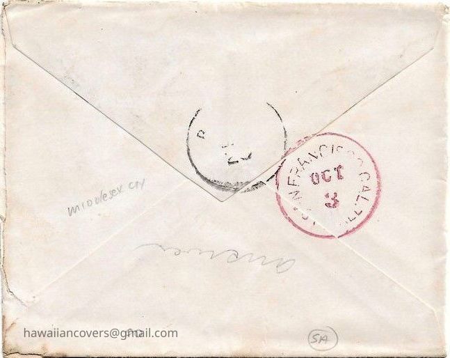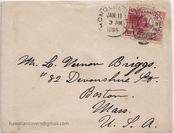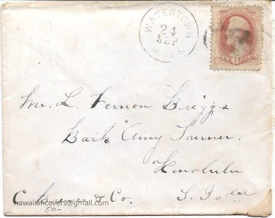 Cover Postmarked 24 Sep from Watertown Mass. to L Vernon Briggs aboard the Bark "Amy Turner" Honolulu, "S. Isles"
