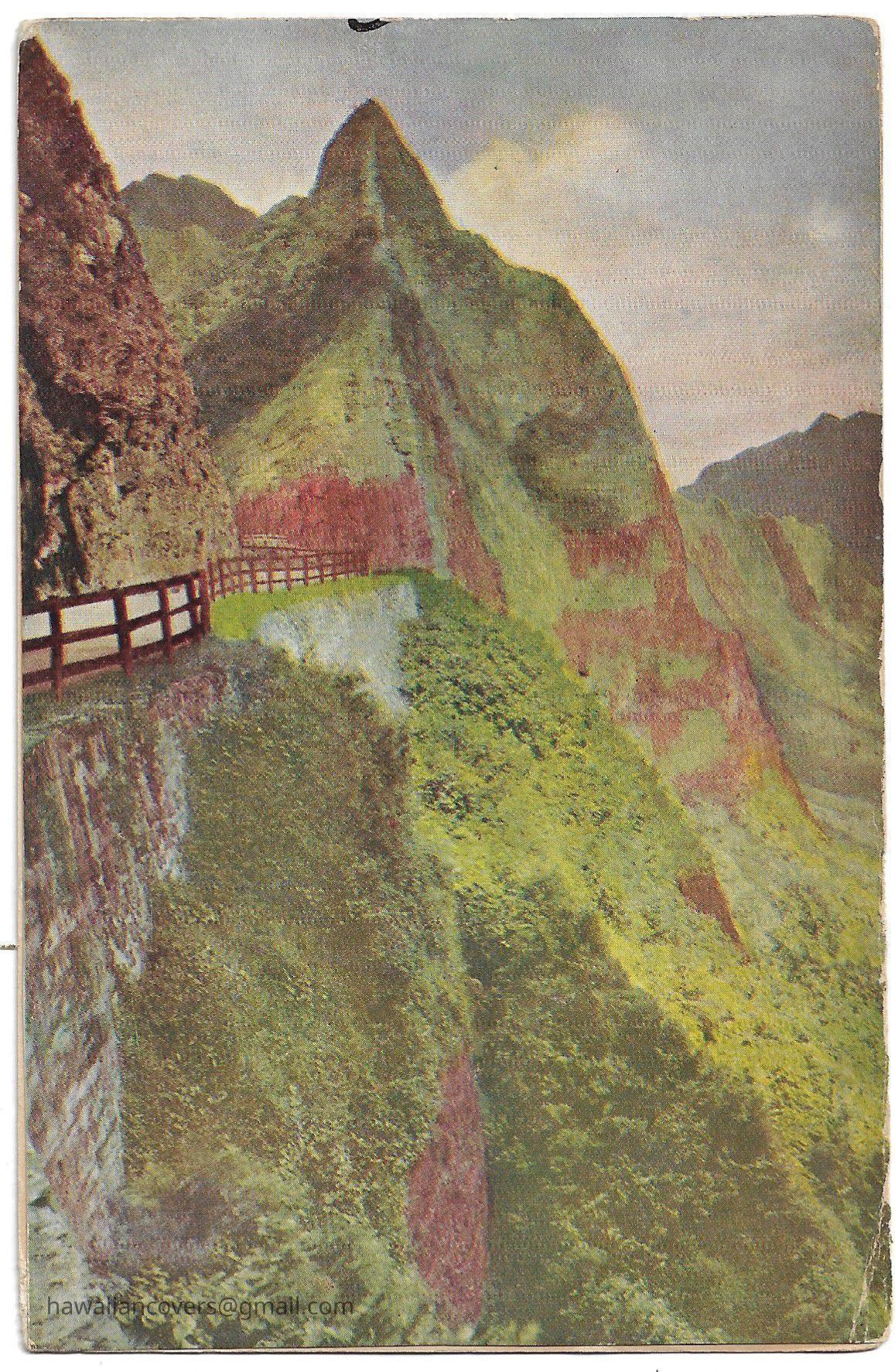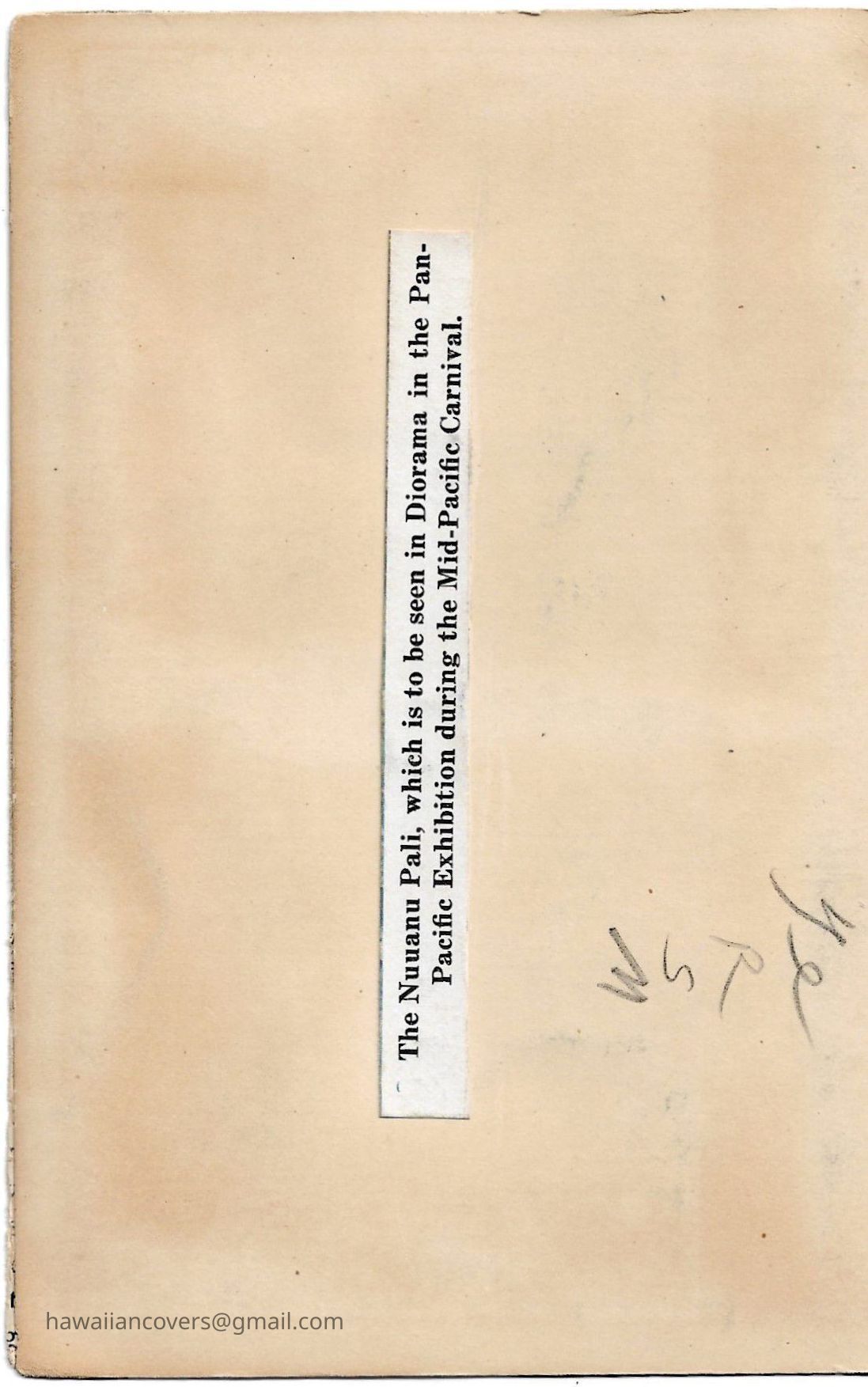 Inscribed on cardstock back "The Nuuanu Pali, which is to be seen in Diorama in the Pan-Pacific Exhibition during the Mid-Pacific Carnival.Created By