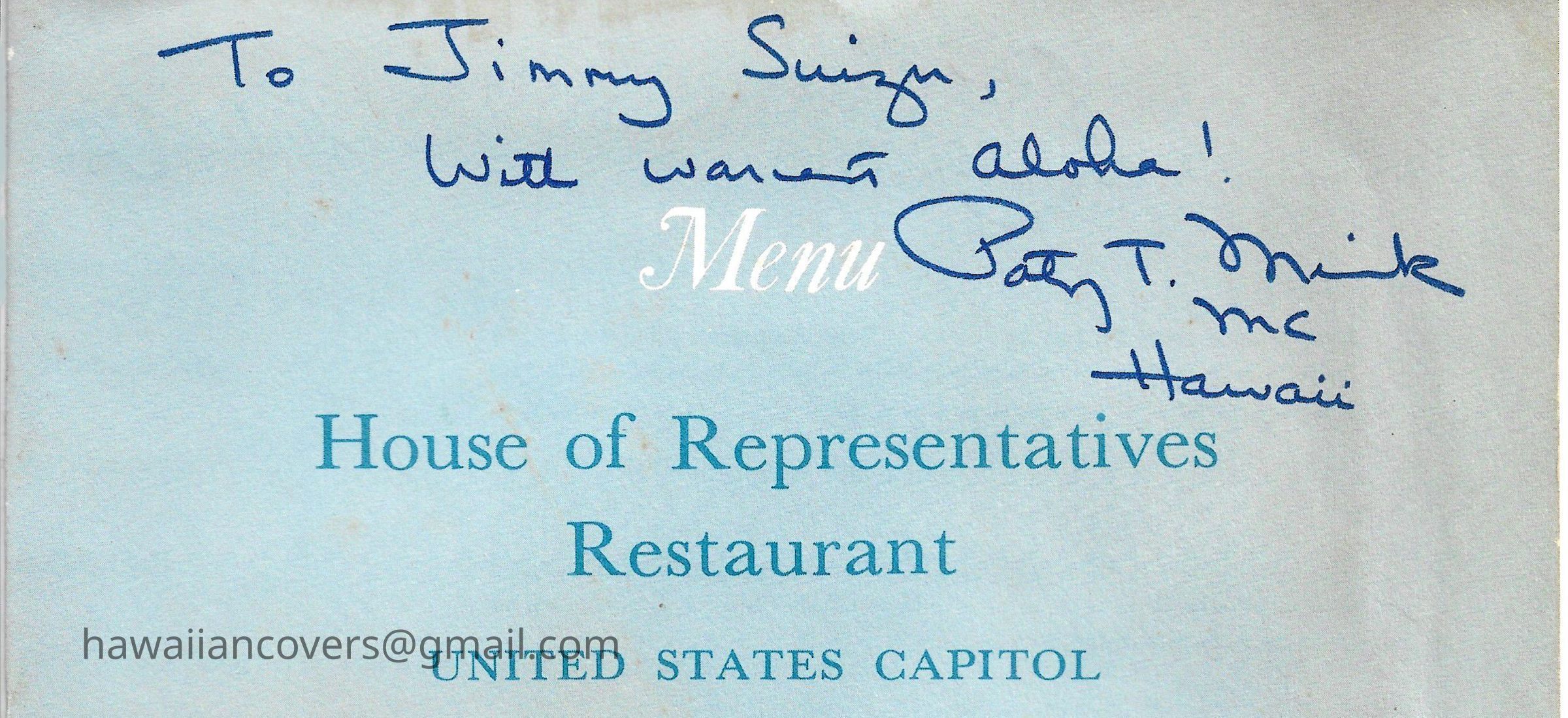However, scanned Menu from the House of Representatives Restaurant is genuine and was signed by the Congress woman in front of the Author's father-in-law.