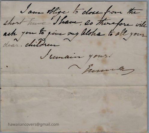 "I am oblige to close from the short time I have, so therefore will ask you to give my Aloha to all your dear children. I remain yours, ~Emma_R~"