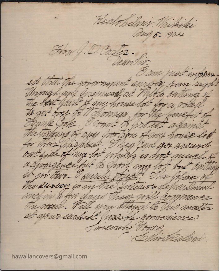A one page hand written letter, Kealohilani, Waikiki, dated Aug 5, 1904 to J. O. Carter, (Liliuokalani's attorney) concerning her premises at Palolo.Created By