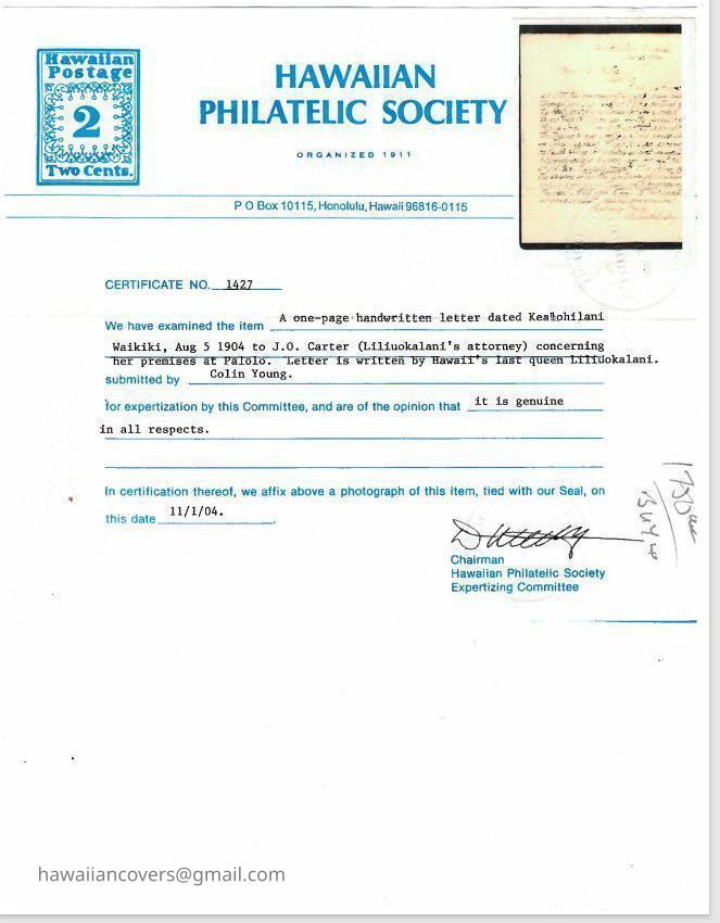 Queen Liliuokalani Letter to J O. Carter Aug 5, 1904Description
