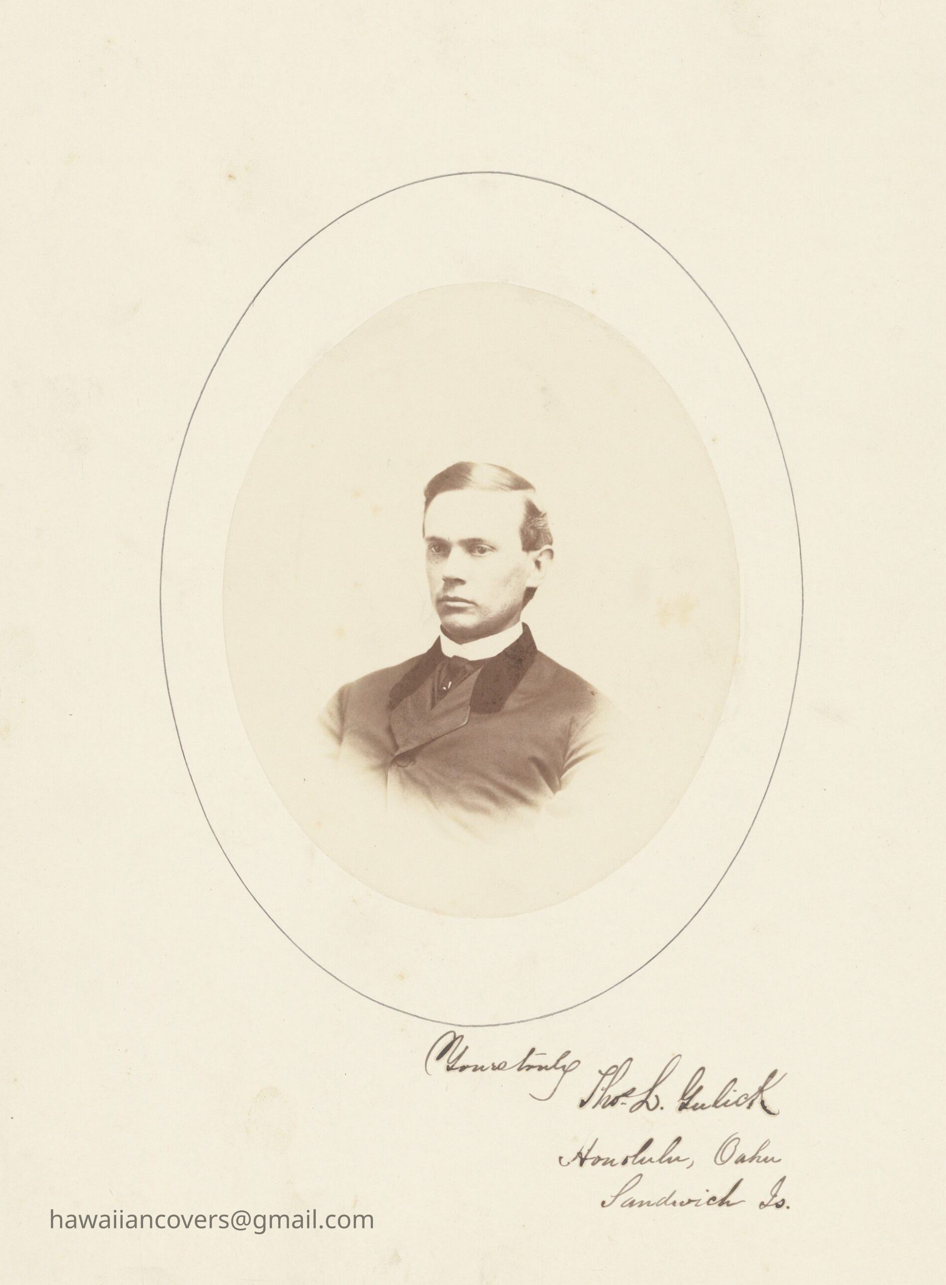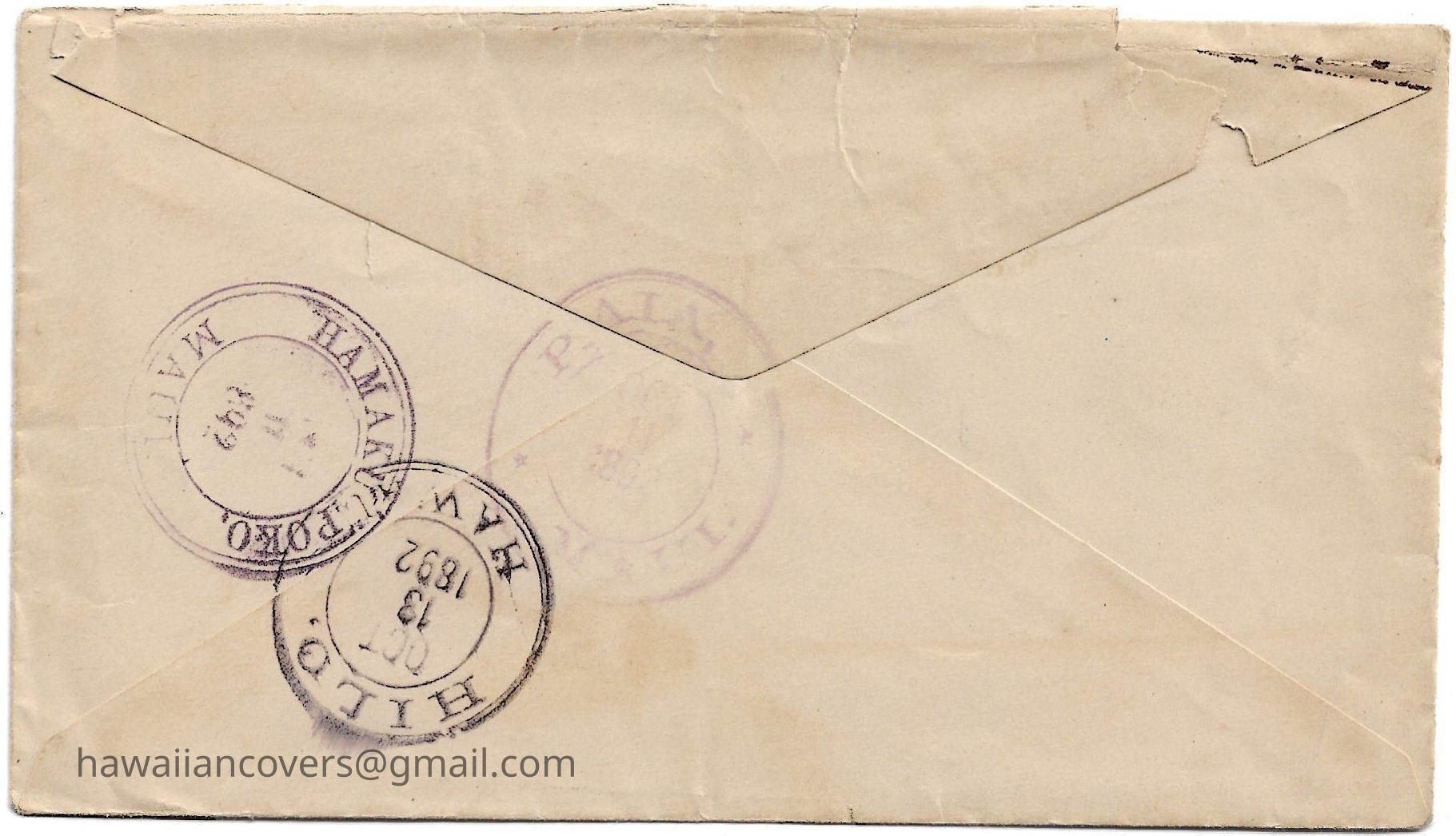 Inscribed Cover sent Oct 10, 1892 by Thomas L. Gulick. Thomas Lafron Gulick was born April 10, 1839, married Alice E. Walbridge (1843–1911) in 1872, and joined his brother William in Spain in 1873. In 1883 they left Spain and worked in Cuba, Las Vegas, Nevada; and New Mexico. They returned to Hawaii in 1886, where he was pastor of Makawao Union Church 1887–1892. In 1893 they moved to Philadelphia, where she was matron and he chaplain at the Penn Presbyterian Medical Center. On an expedition with Samuel Thomas Alexander and Annie Montague Alexander to Africa, Thomas died on August 15, 1904, in Kijabe, Kenya.