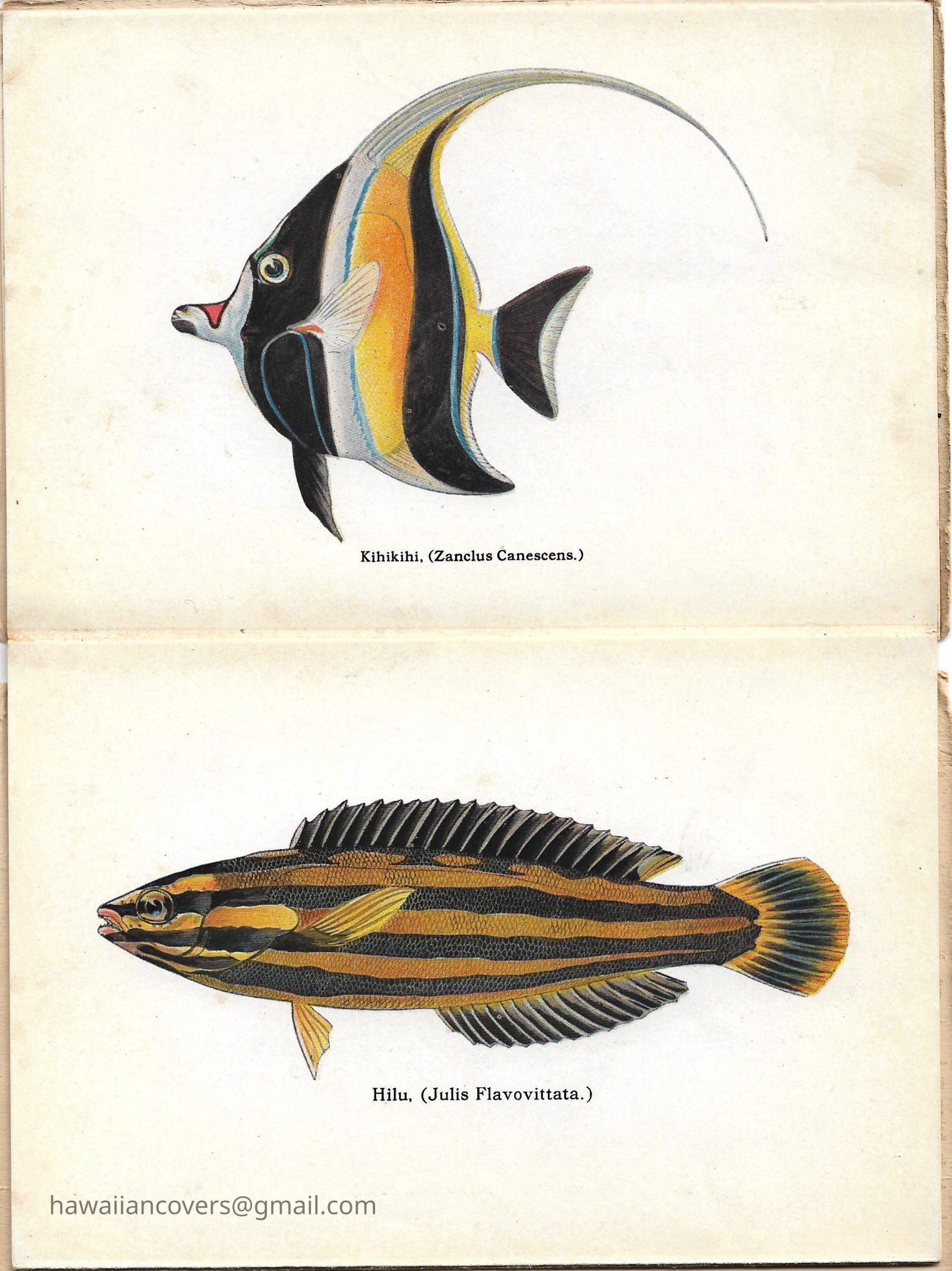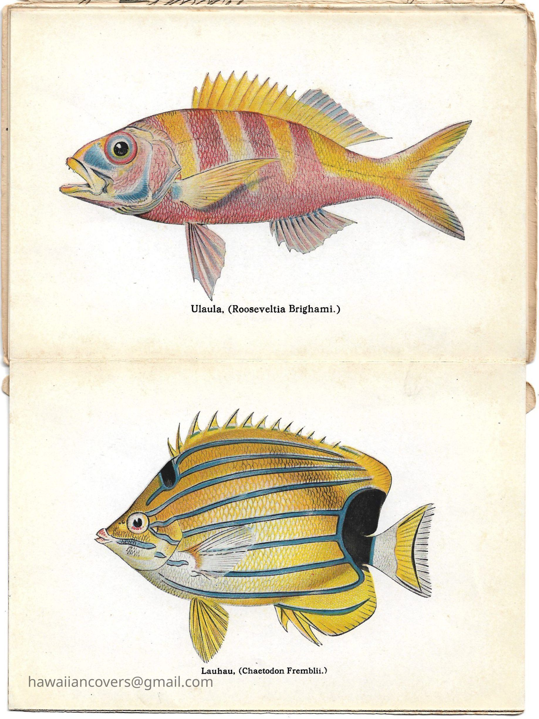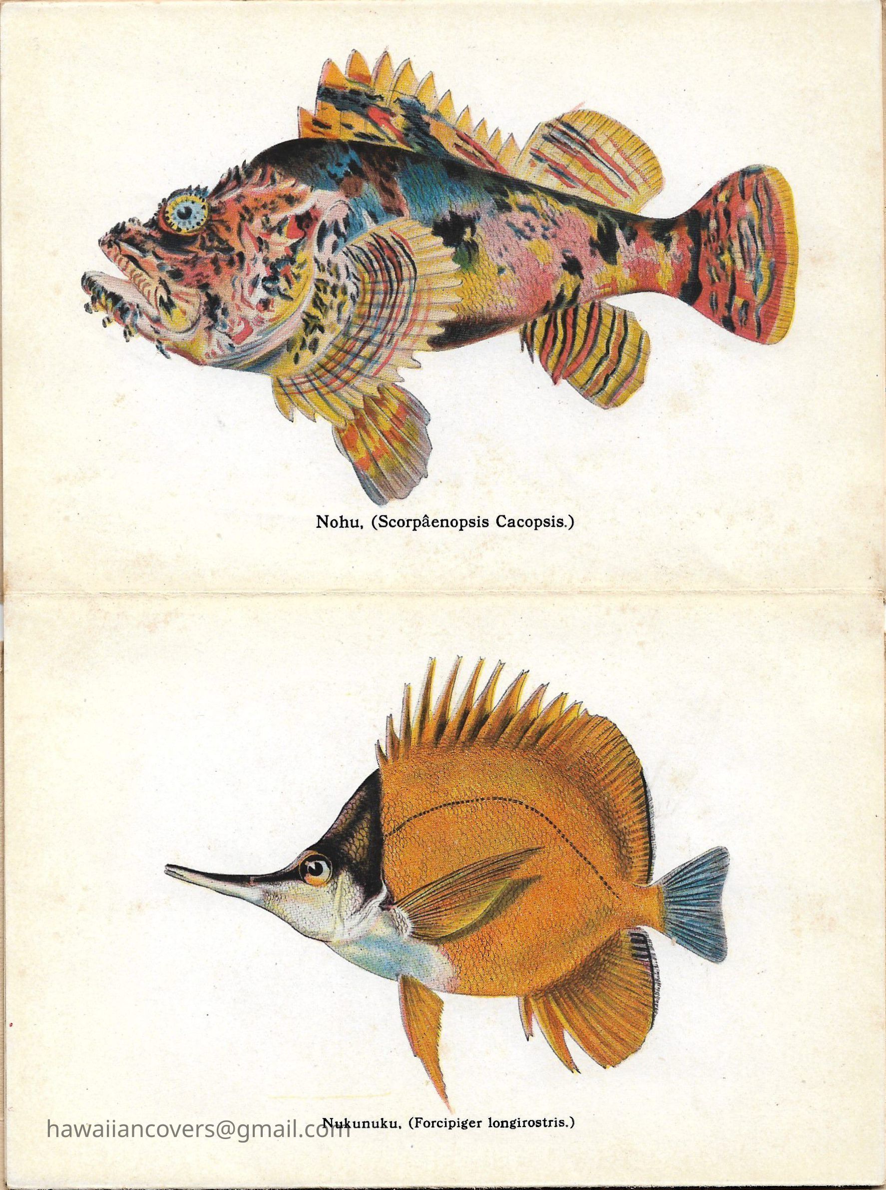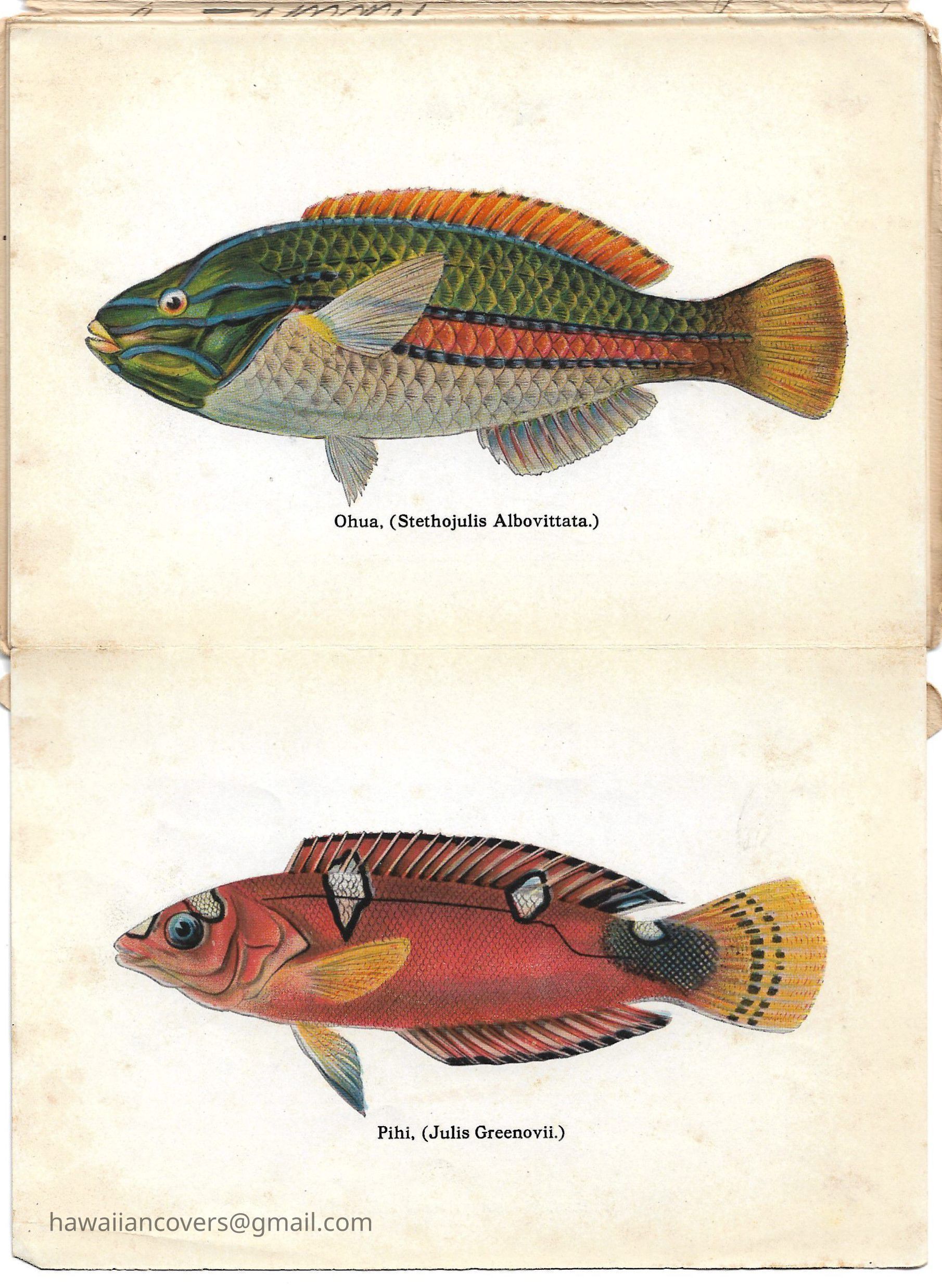A colorful album featuring the fishes of Hawaii. It is a souvenir mailing piece produced by the Honolulu Aquarium. Inscribed by sender April 10th, 1916.Created By