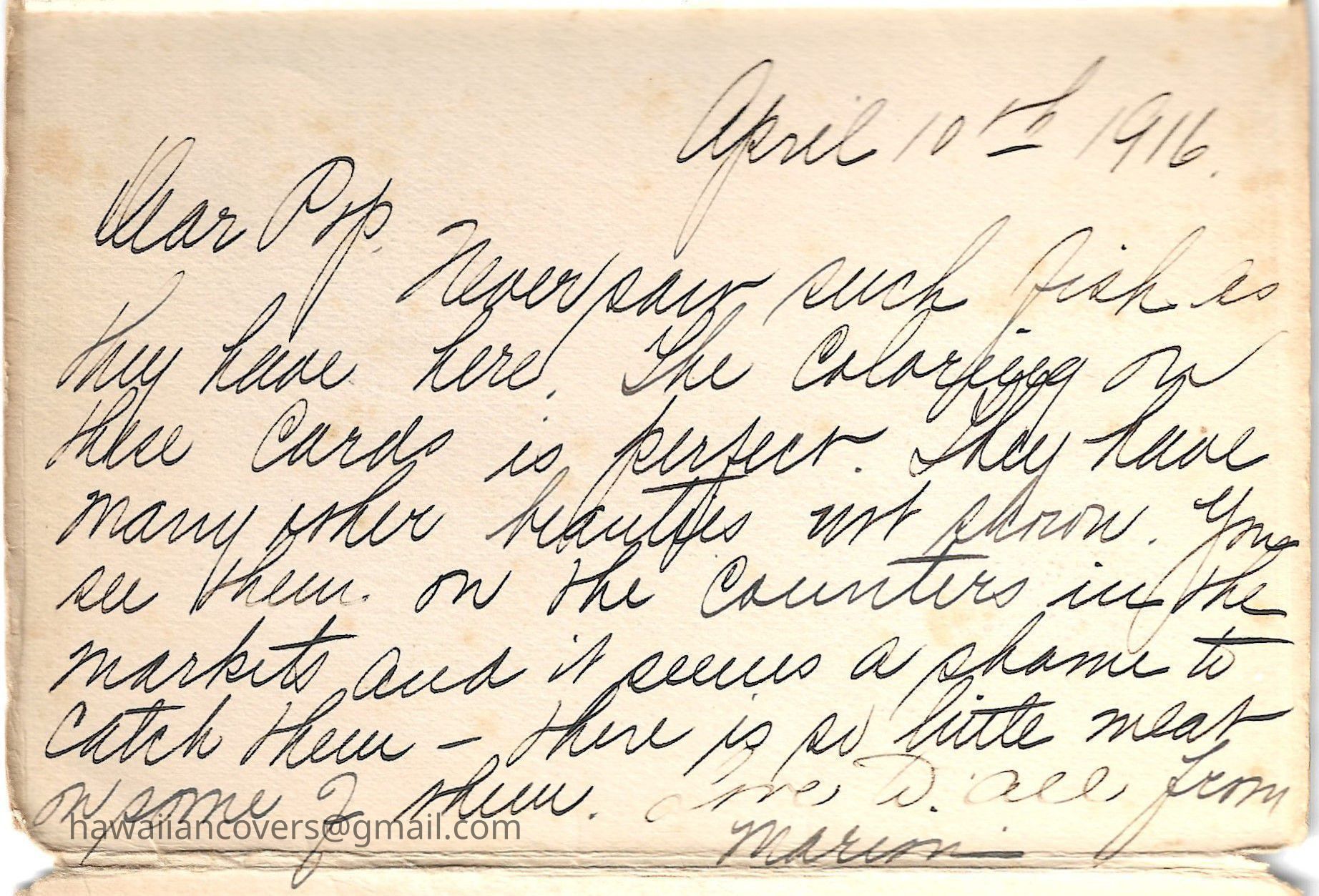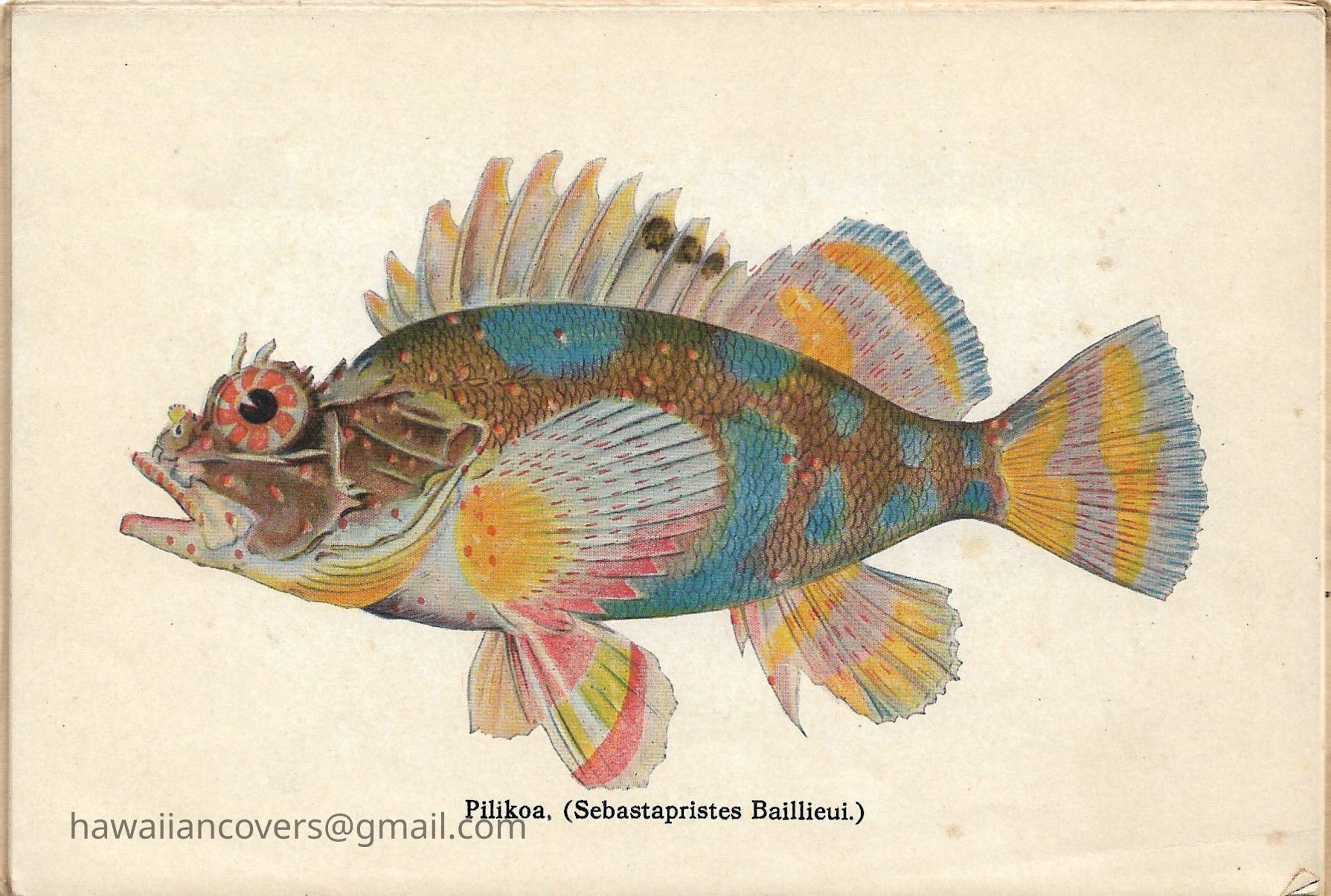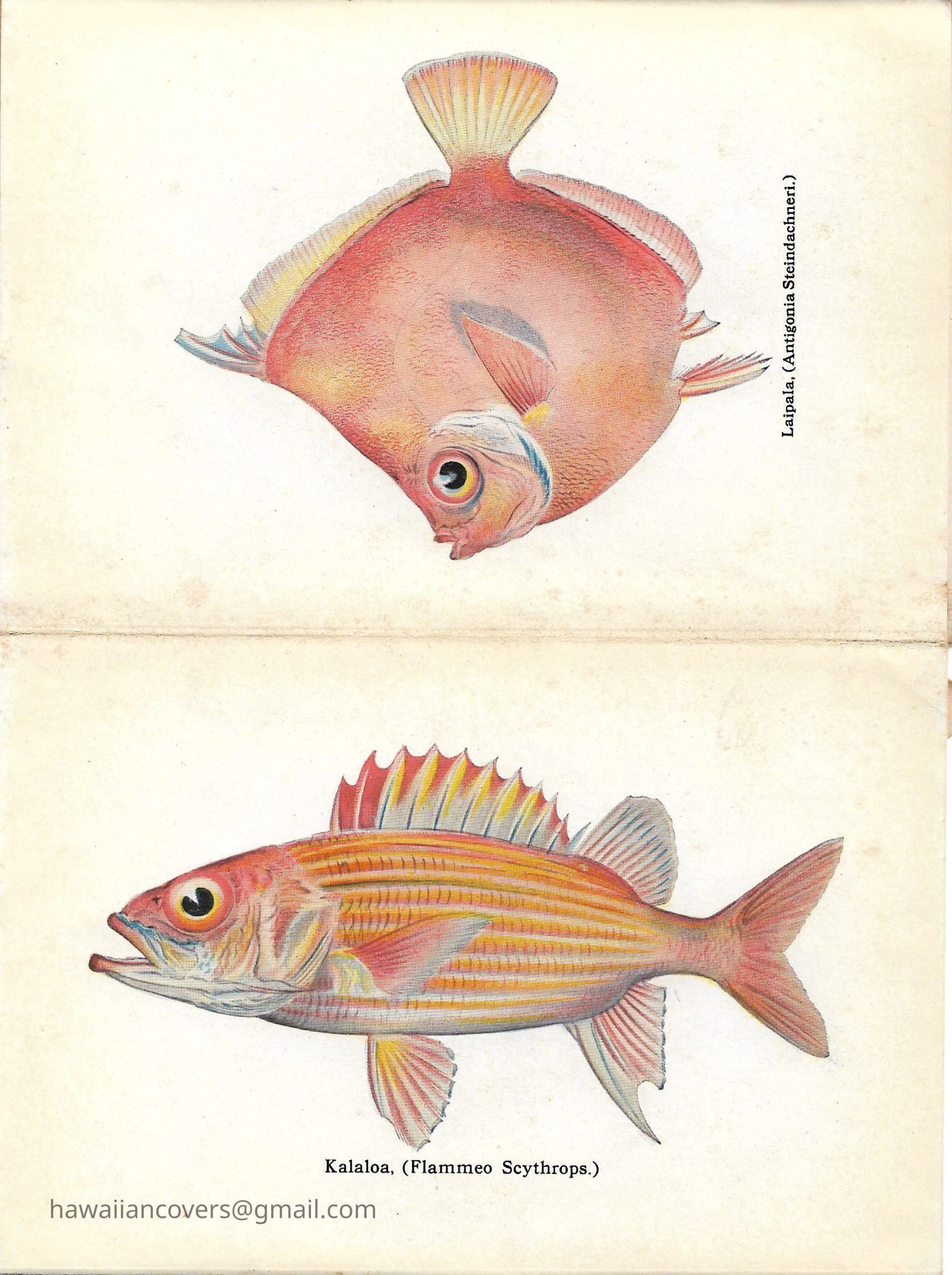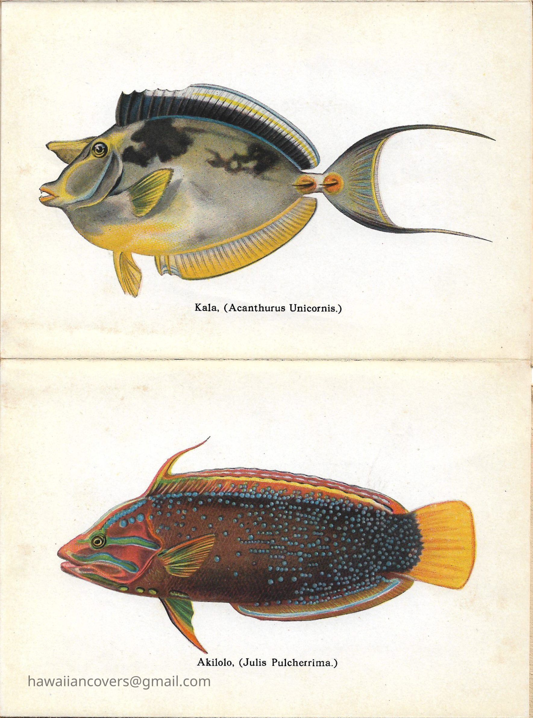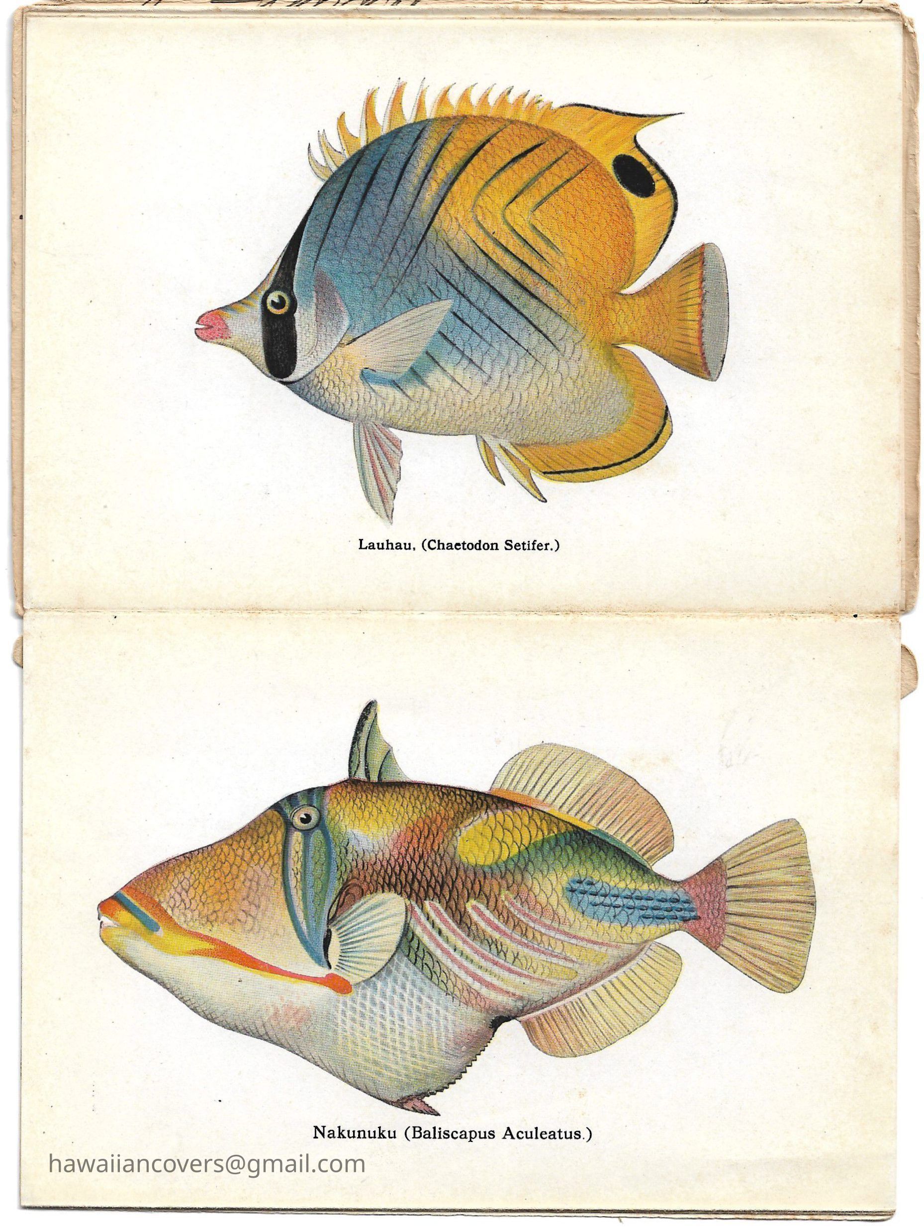 A colorful album featuring the fishes of Hawaii. It is a souvenir mailing piece produced by the Honolulu Aquarium. Inscribed by sender April 10th, 1916.Created By