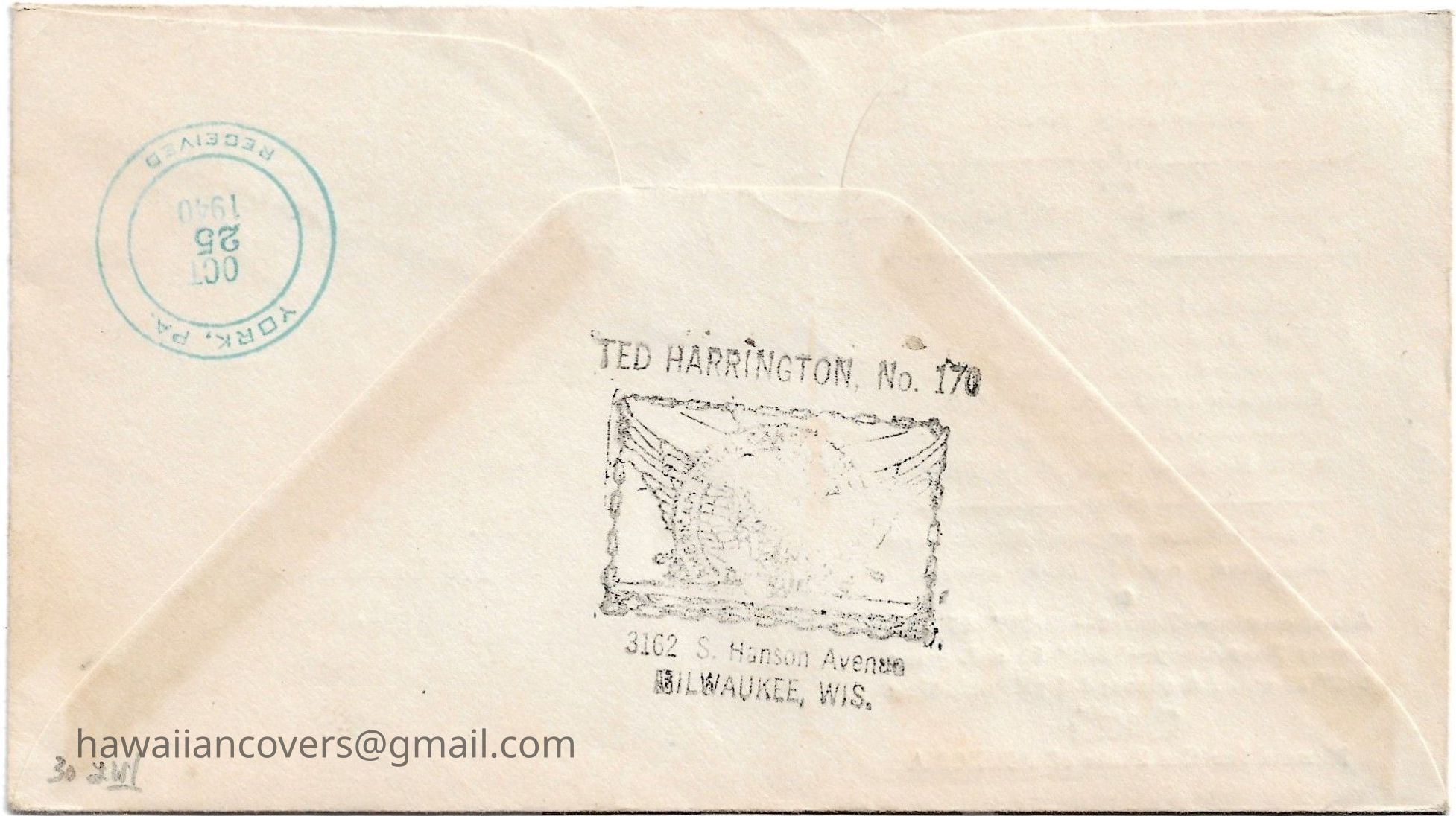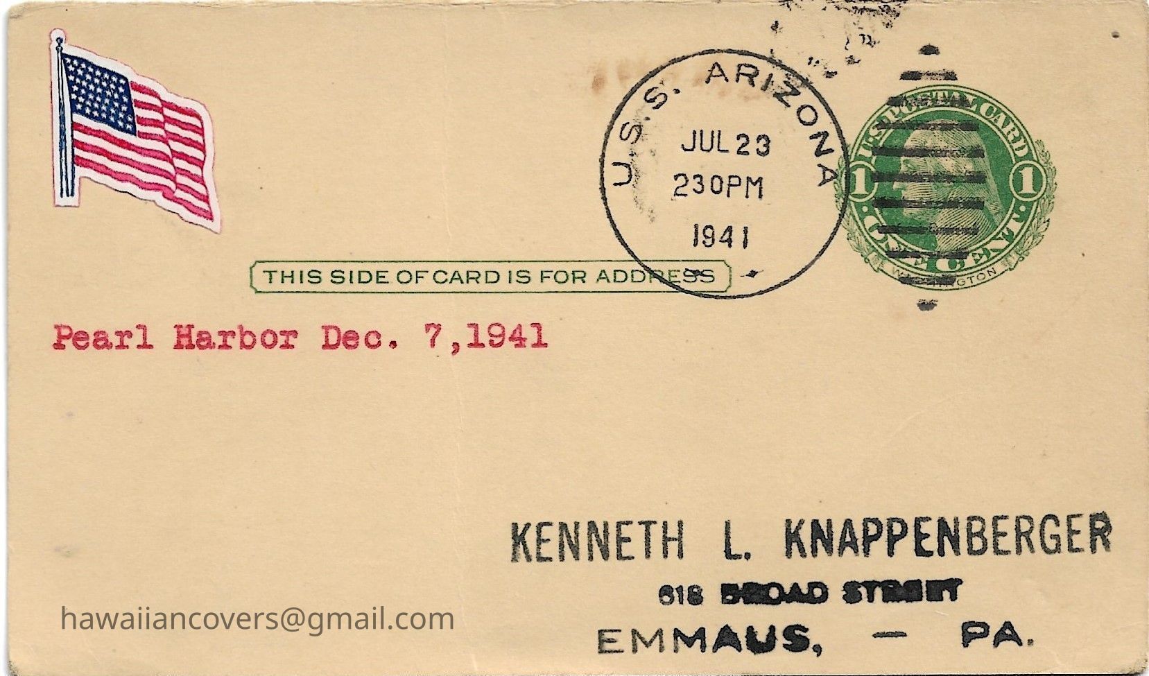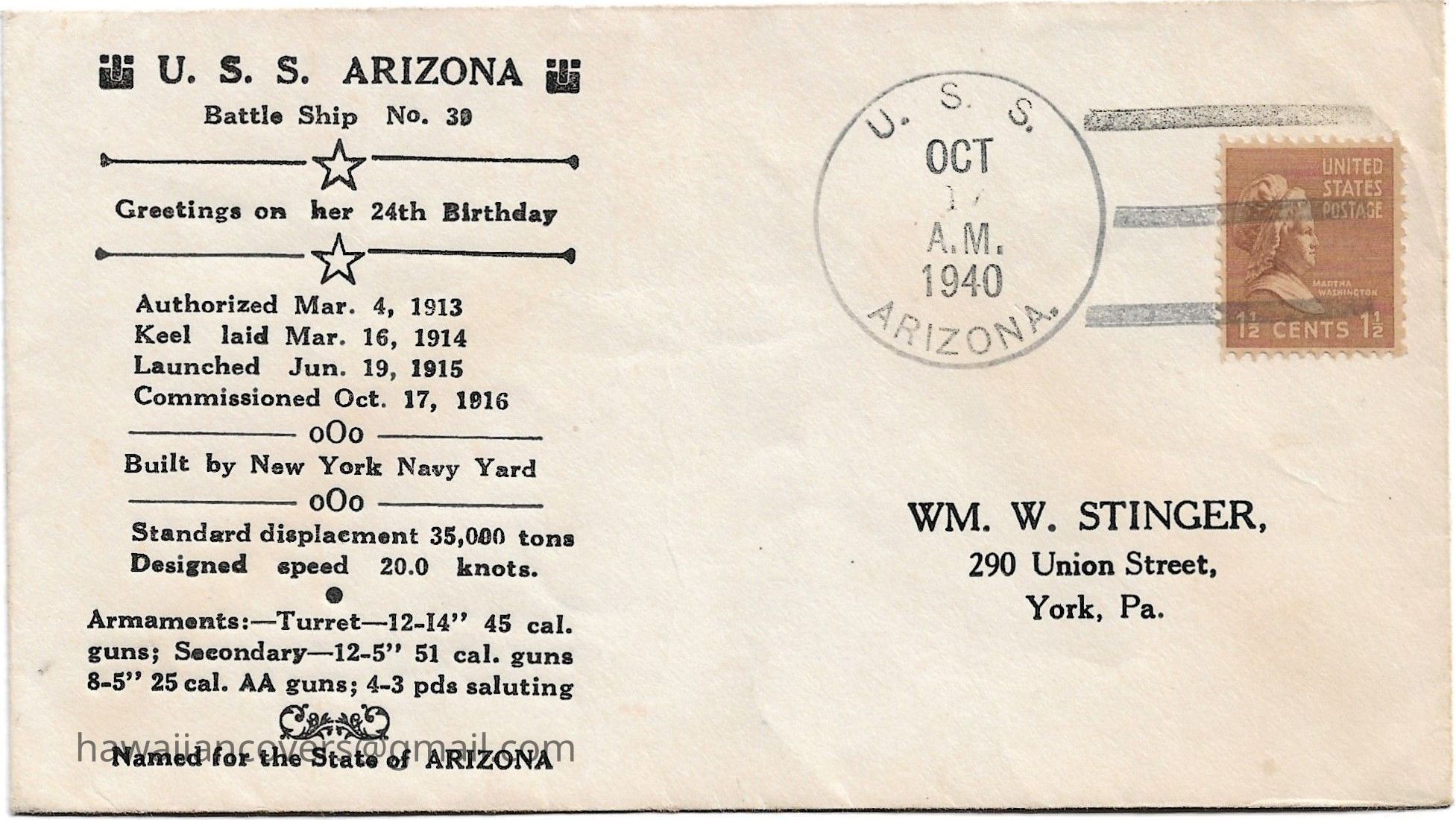 Sunk at Pearl Harbor December 7, 1941. Historic 1940 Navy Day Cover. US Stamp Sc #805 on USS ARIZONA Navy Cover Ted Harrington Cachet Oct 17, 1940. Sunk at Pearl Harbor Dec. 7, 1941Created By