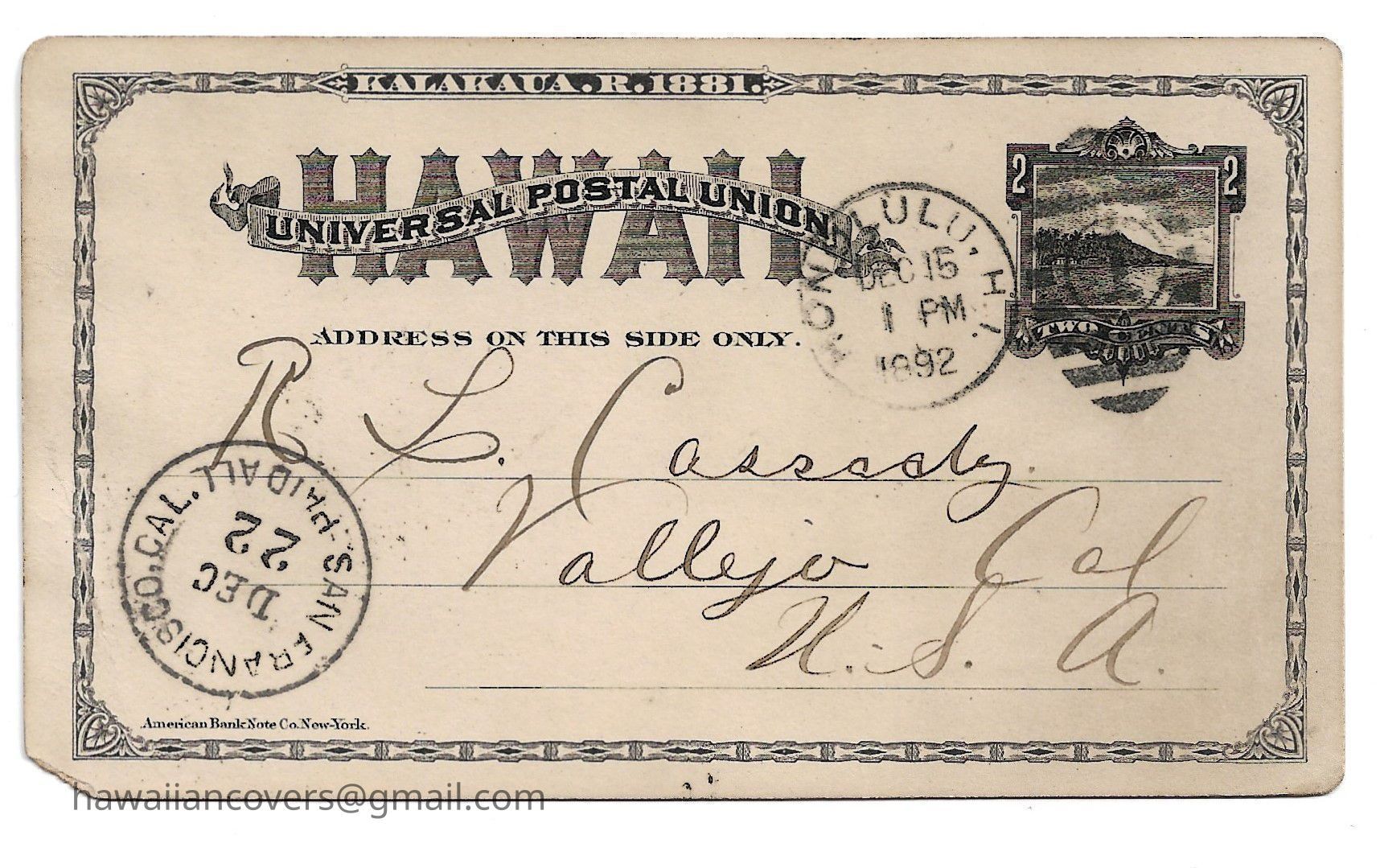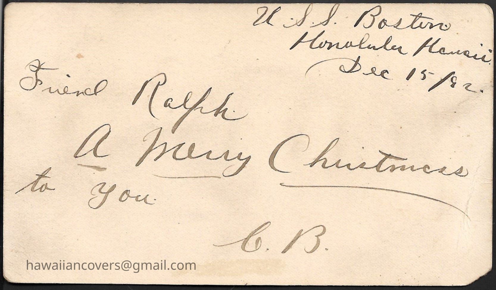 Postal Card from "C. B." aboard the USS Boston, Dec 15, 1892 to R L Cassady (?)