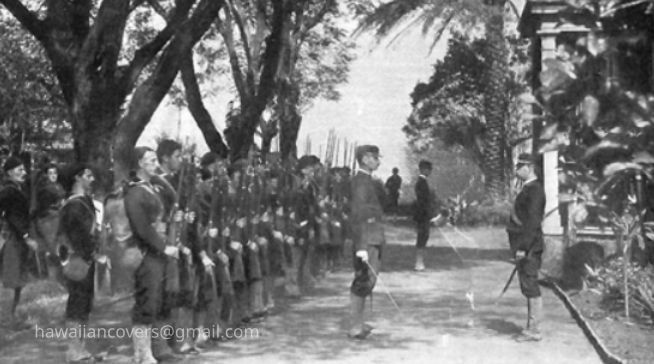 The USS Boston's landing force on duty at the Arlington Hotel, Honolulu, at the time of the overthrow of the Hawaiian monarchy, January 1893. Lieutenant Lucien Young, USN, commanded the detachment.