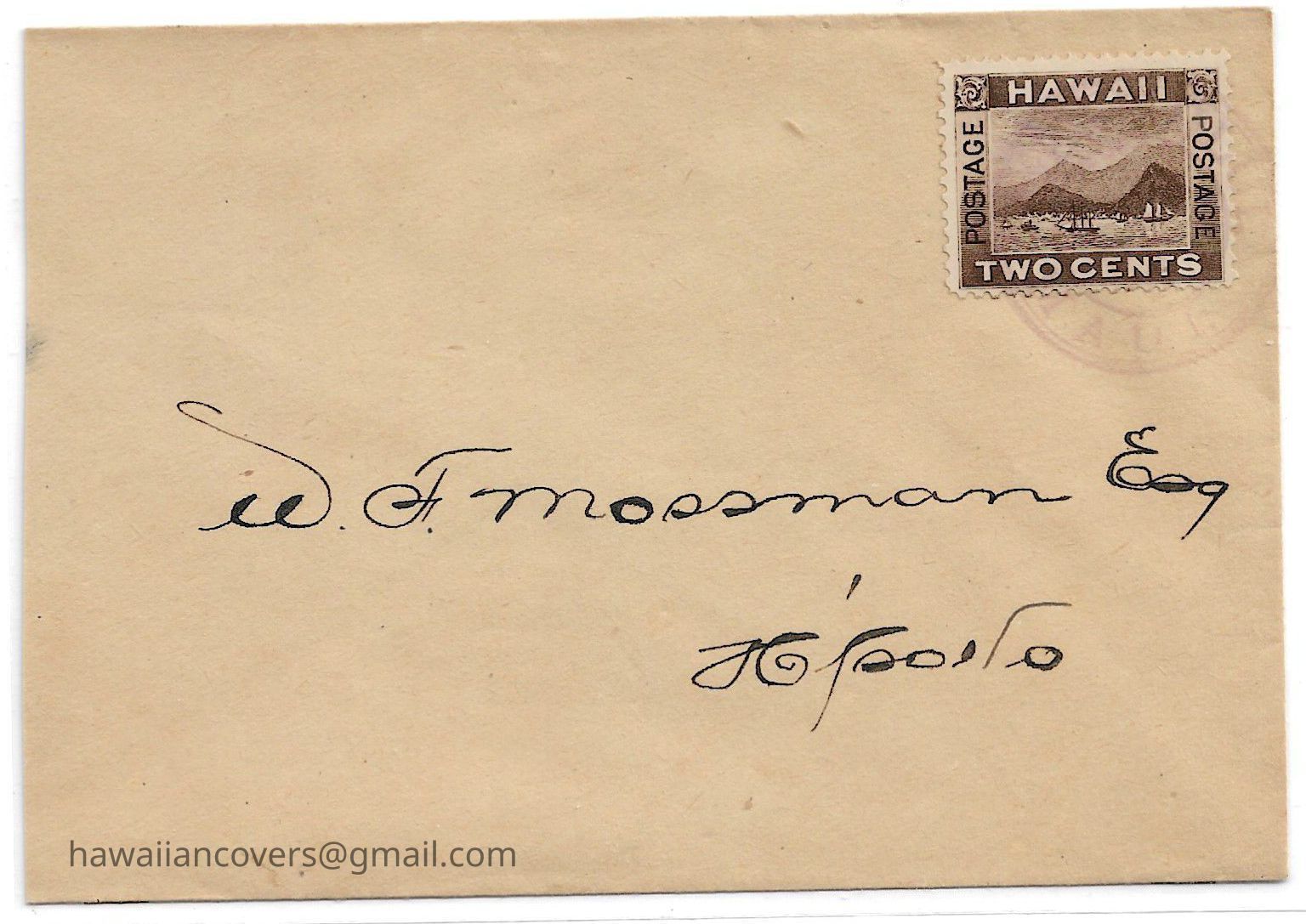 W. F. Mossman (1887-1894)[he also served as customs collector at Kahului, formerly postmaster at Wailuku and future postmaster at Hamakuapoko; Mossman waffled in 1893 about whether he would keep the Kahului PM post and then tried to hang onto both the Kahului and Hamakuapoko postmasterships, running Kahului with a series of acting PMs.Created By