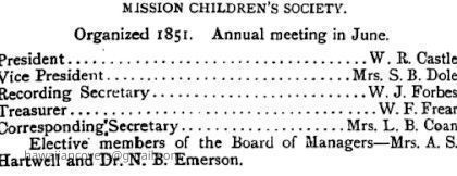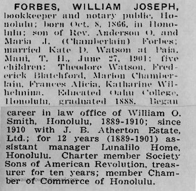 W. J. Forbes was the son of Rev. Anderson O. Forbes, born Oct. 8, 1866. He began his career in the law office of William O. Smith, Honolulu. Assistant Manager of Lunalilo Home, Honolulu. He was a Charter member of the Society Sons of American Revolution, treasurer for ten years; member of the Chamber of Commerce of Honolulu.Created By