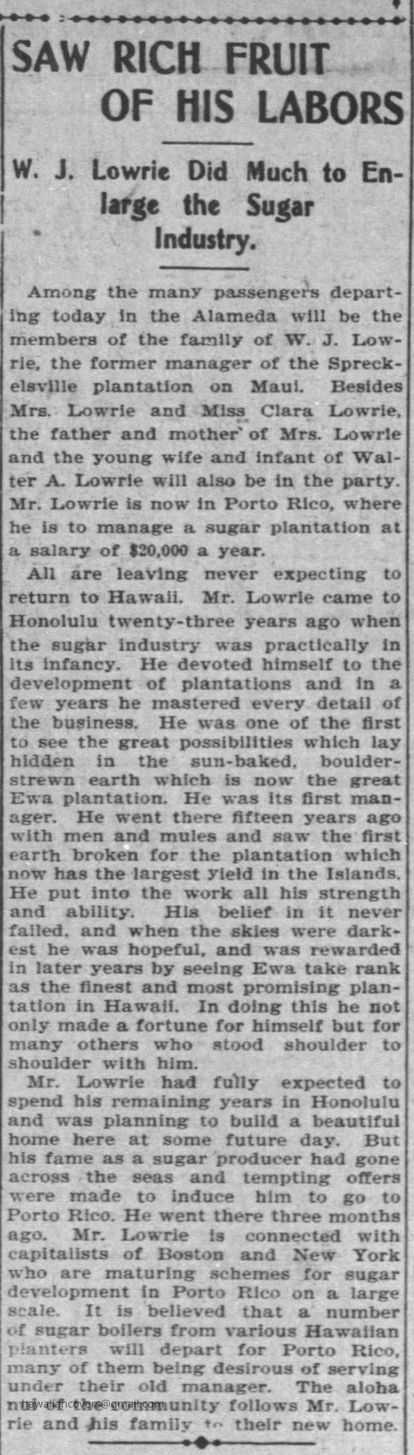 W. J. Lowrie, Manager, Hawaiian Commercial & Sugar Co.Description