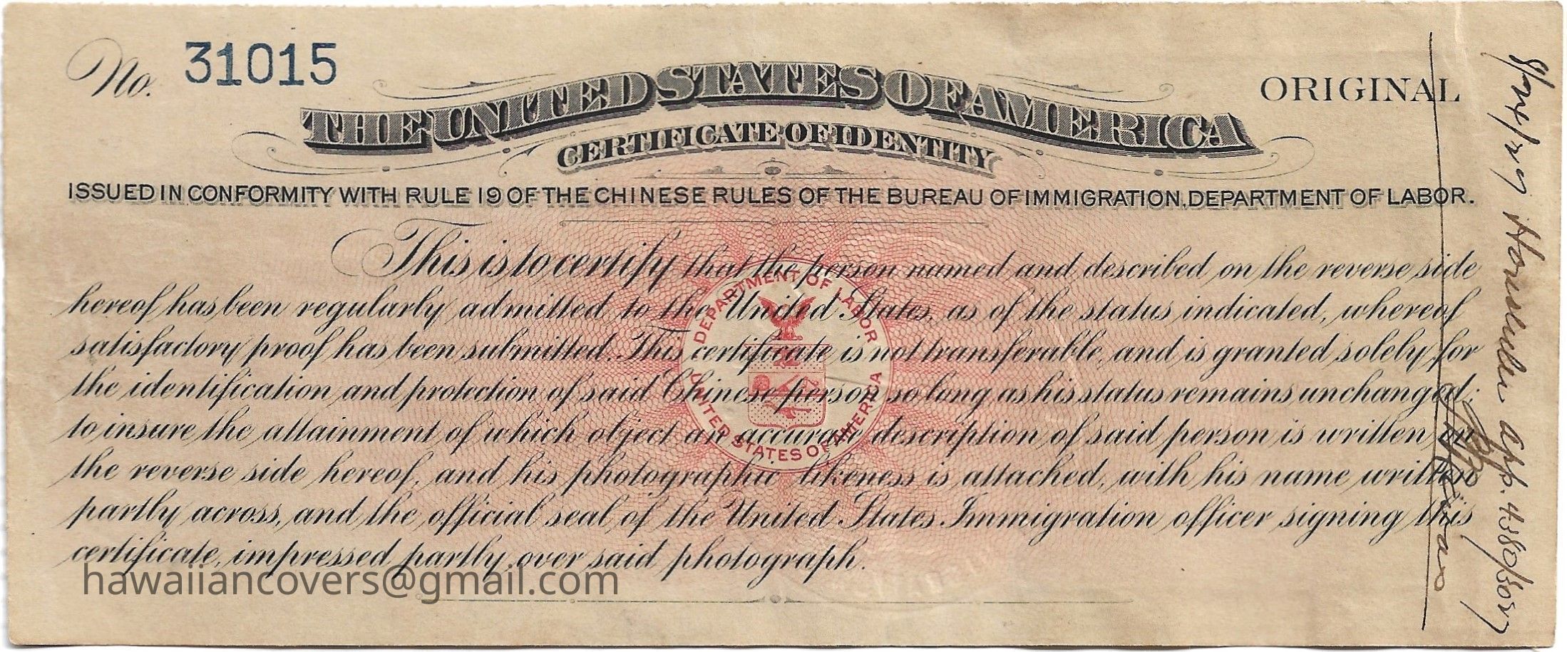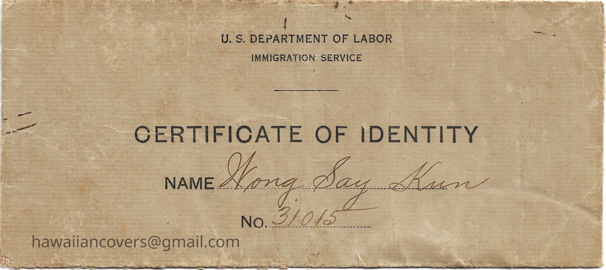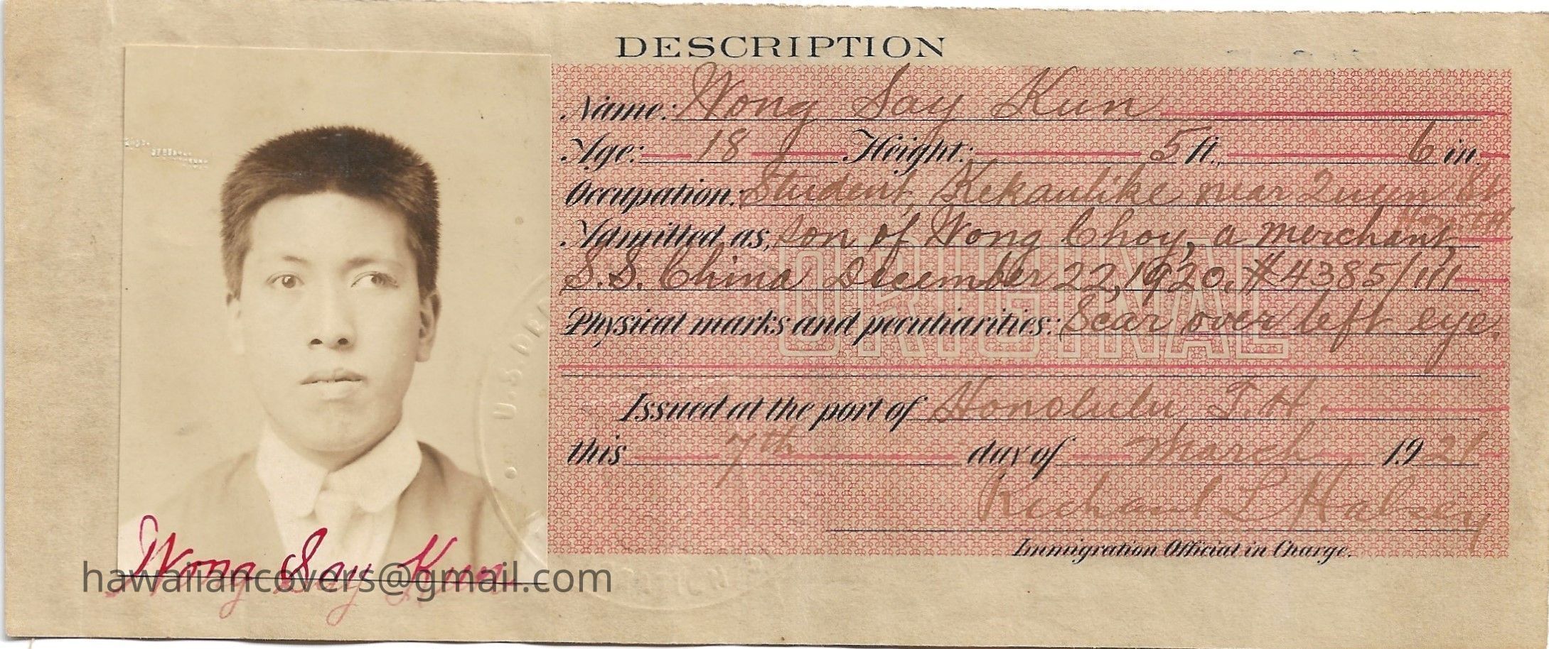 Inscribed Name: Wong Say Kun Age: 18 Height 5 ft 6 in. Occupation: Student, Kekaulike near Queen St Hon, T.H. Admittted as: son of Wong Choy, a merchant, S.S. China December 22, 1920#4385/111 Physical marks and peculiarities: Scar over left eye. Issued at the port of Honolulu, T.H. this 7th day of March 1921 Richard L Halsey - Immigration Officer in Charge.