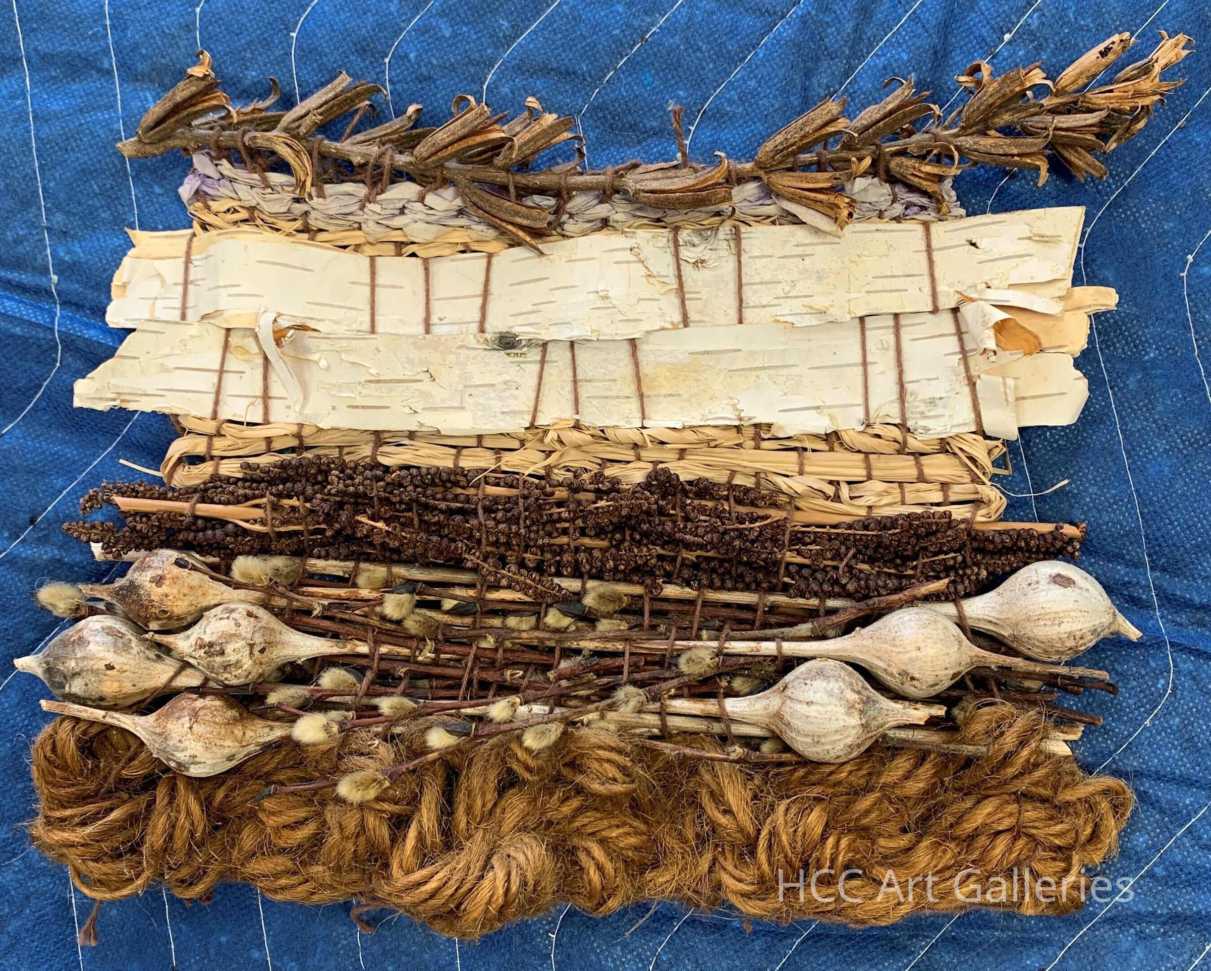 The top of this sculpture starts with plant material, and is woven together with wood, tree bark, plant stems, bulbs that look like onions, and rope at the bottom. The entire sculpture is mostly hues of browns and tans.Collection