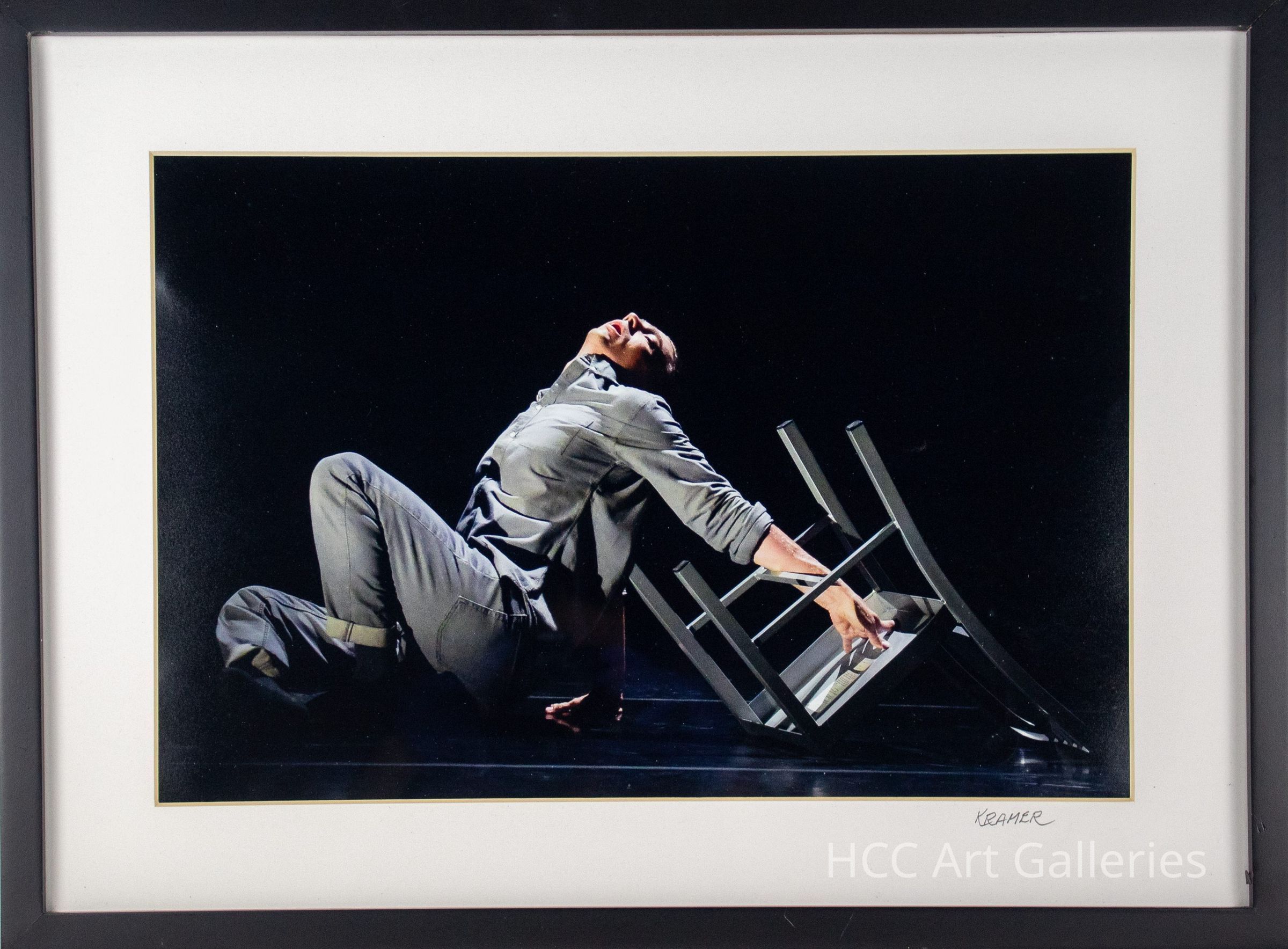 A framed photograph of a dancer in action. They are wearing grey and interacting with an overturned chair on stage.Collection