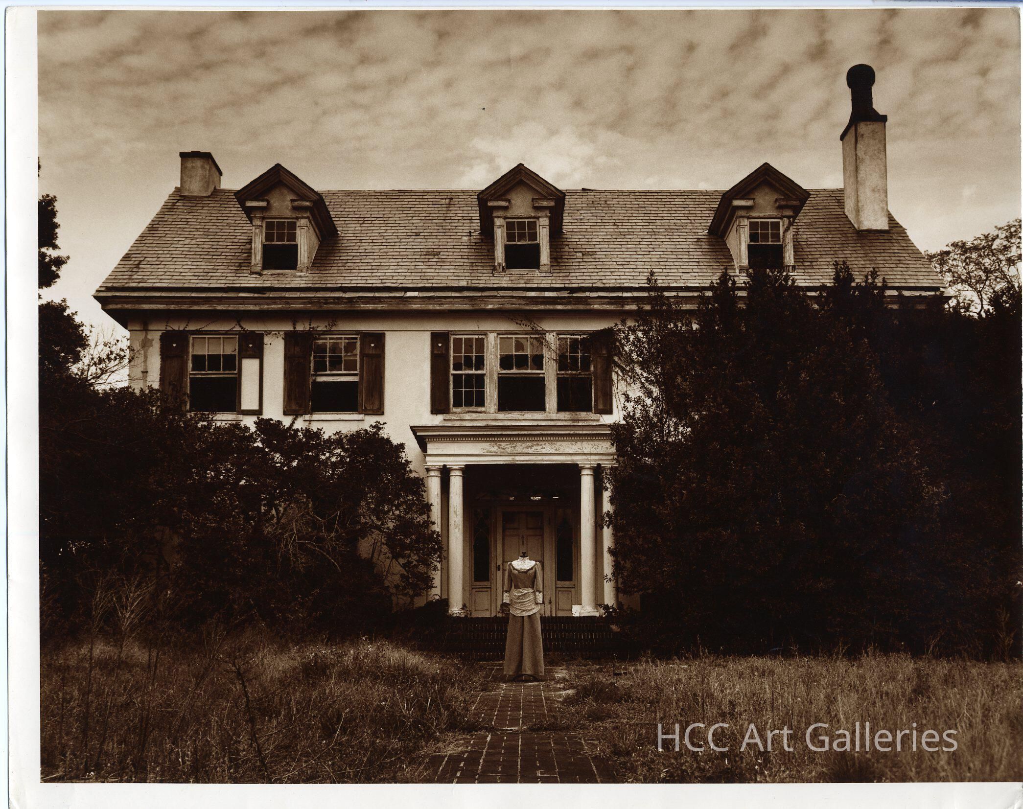 A dress form in front of the entryway of an older, three story home. The home appears abandoned and overgrown with foliage.Photograph Details