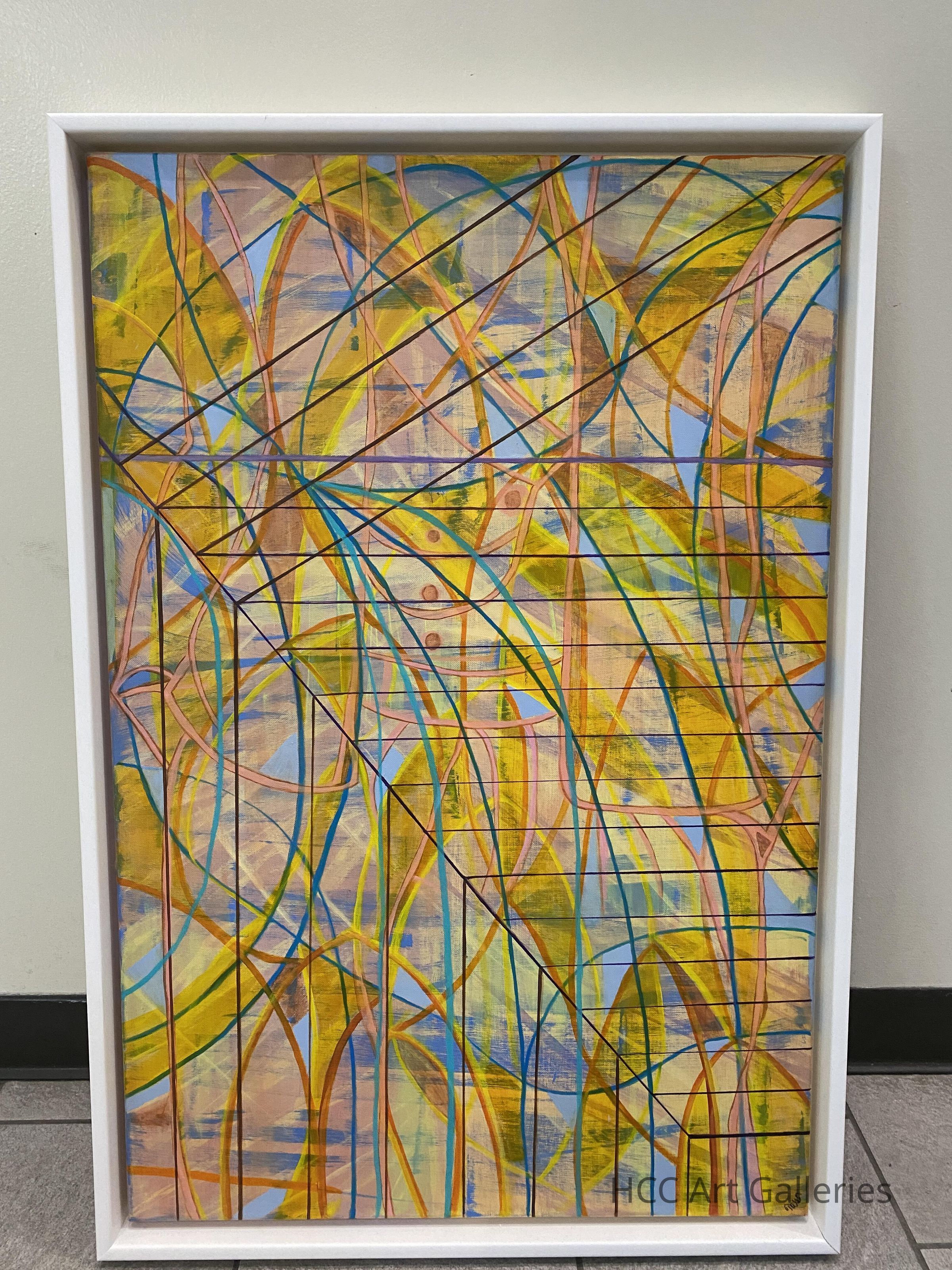 Many lines of black, purple, blue, and pink intersect throughout the canvas from various directions. Within some of the shapes created by these lines are tints of transparent yellow. Primary colors are pastel blues, pinks, and yellows throughout the composition.Collection