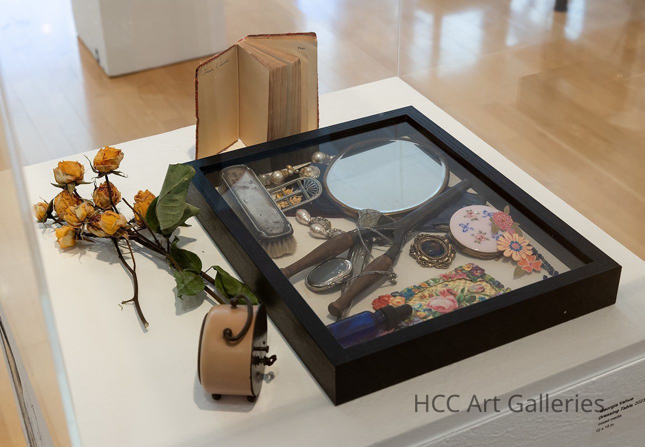 Utilizing many pieces from her grandmother and great grandmother’s dressing table, Georgia Vahue memorializes these deeply personal objects, many of which are associated with femininity, beauty, and time. These things can be prized just as easily as they can be neglected. Even though tastes and perceptions change over time, we find ourselves drawn to the past for novelties and material to create with something new.