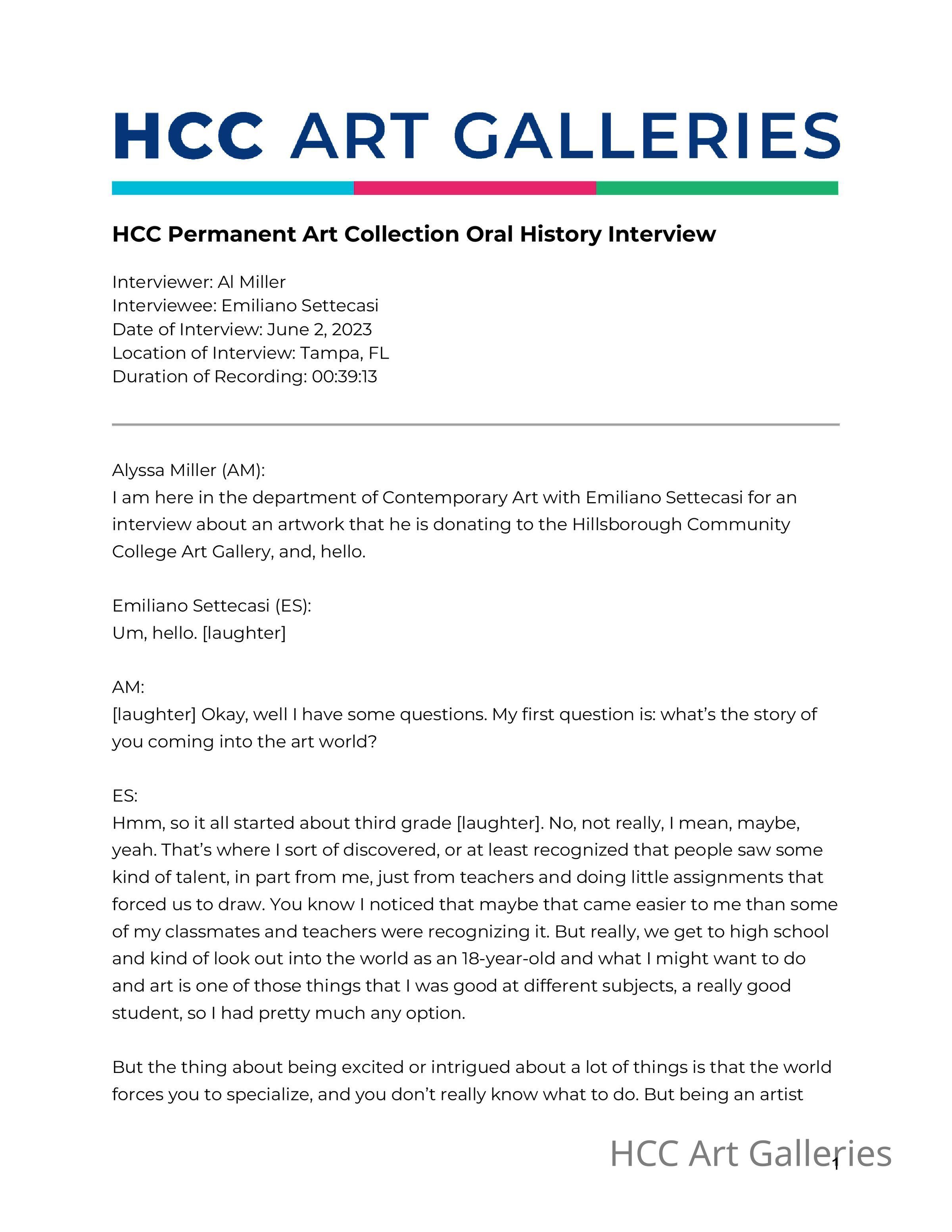 Emiliano Settecasi talks about his artistic career, his work in the Permanent Art Collection "Something to Remember," and his connection to the Tampa Bay arts community.Exhibition