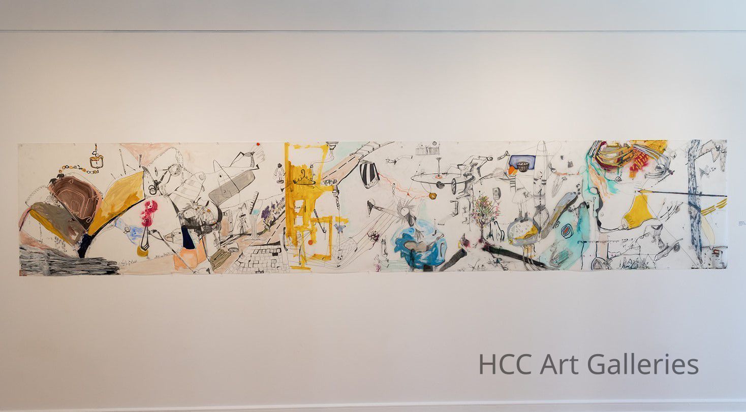 Lisa McCarthy’s Enter Here is an expansive mixed media mural that blends memory and spontaneous drawing. Layering Mylar over paper, McCarthy creates vivid depth and color in a scene that teeters between celebration and mayhem. Inspired by personal recollections—a pencil stabbing a leather chair, dance lessons, a buried garbage can, eating a hostess cupcake—the work invites viewers to enter anywhere within its swirling network of memory. Exhibited at HCC in the fall of 2023 as part of an exhibition titled Leftovers, McCarthy’s mural also reflects on what we retain from the past—objects, moments or meanings—as both cherished keepsakes and creative remnants, full of potential, nostalgia and emotional charge.