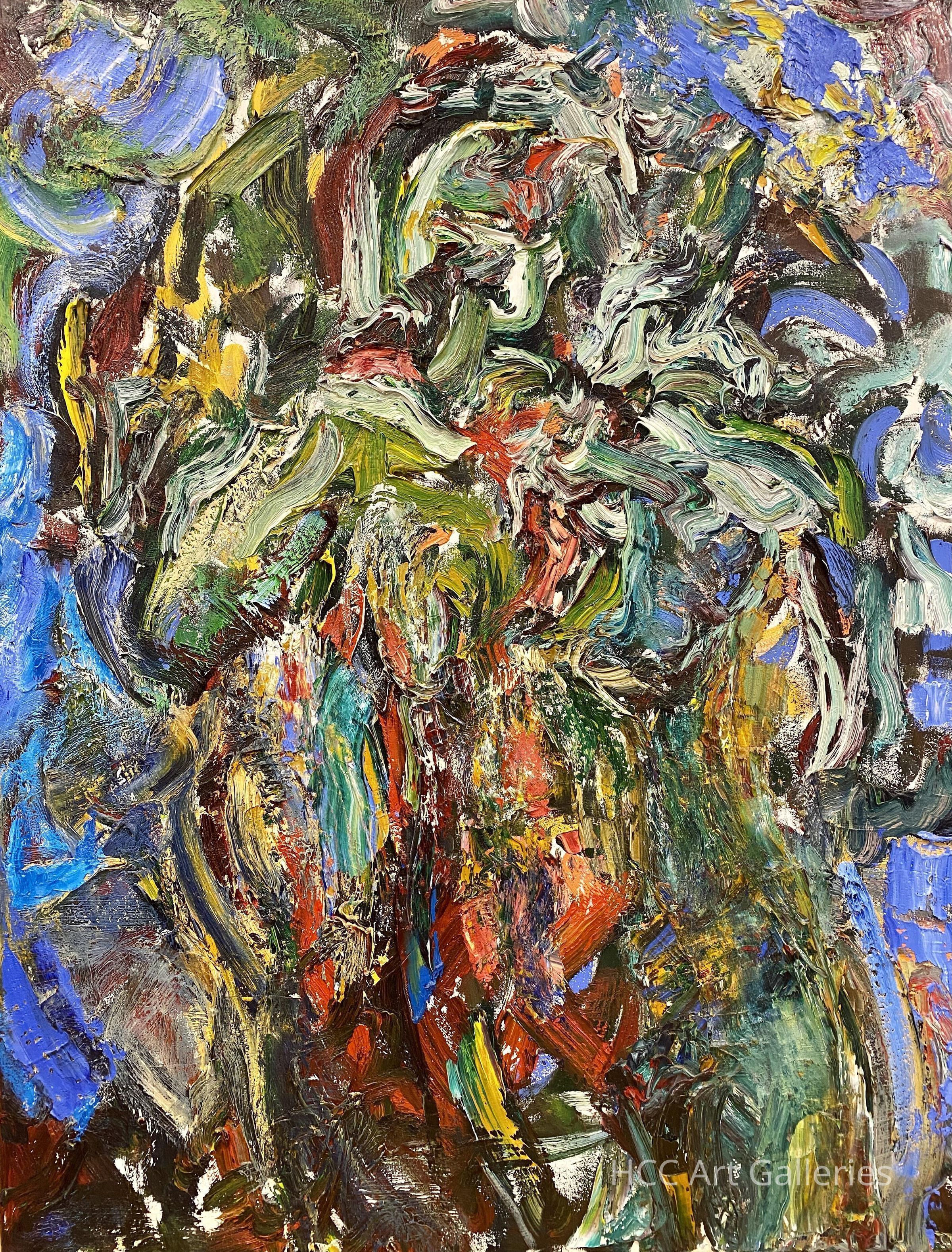Abstract culmination of a wide variety of colors, primarily blues and greens, in sporadic and chunky brush strokes. Lighter blues saturated towards perimeter. Layered wet-on-wet brushstrokes that create an array of colors. The bottom of the canvas is heavy in reds and browns.Collection
