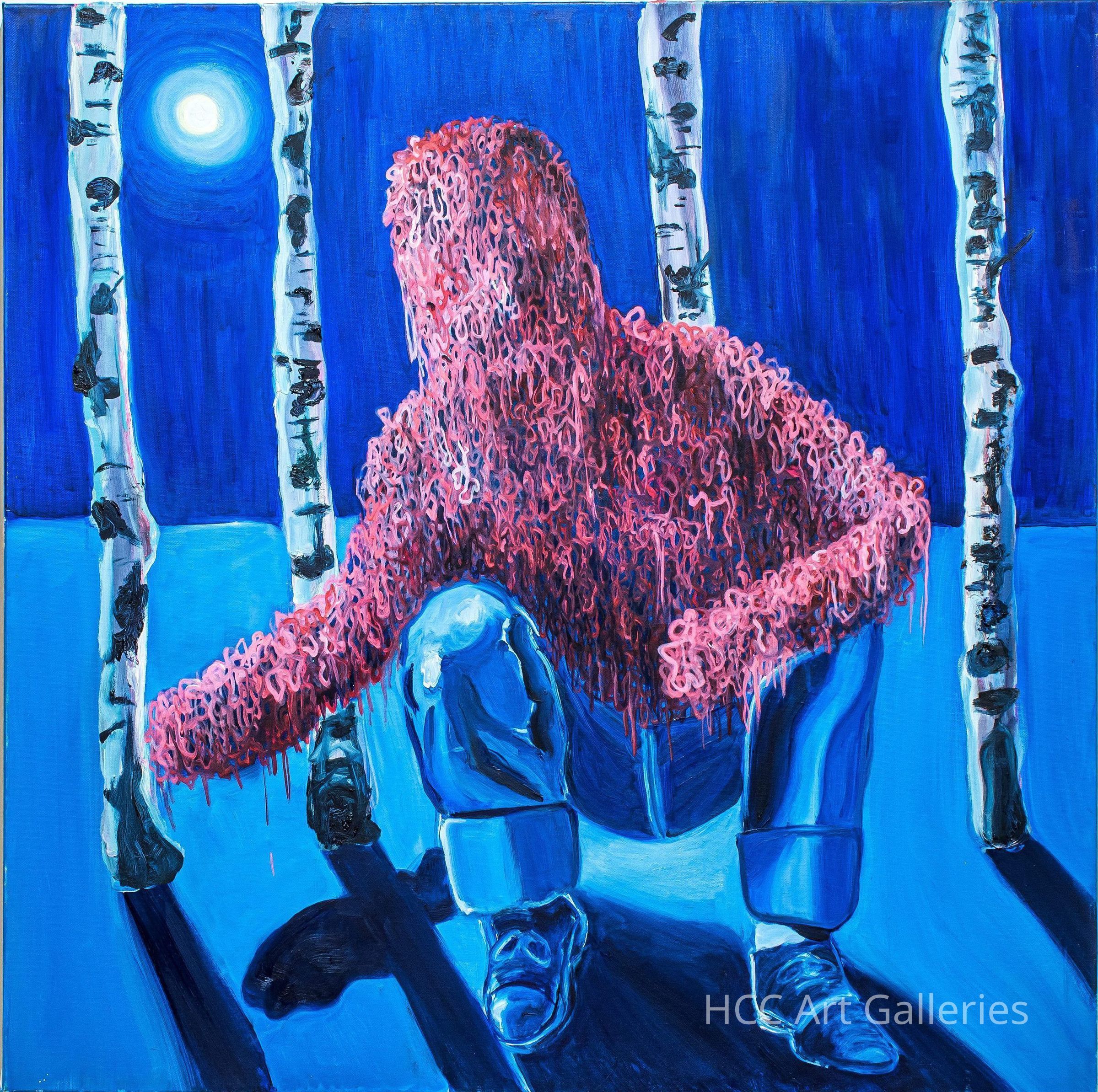 An unframed painting of a crouched figure in jeans and tennis shoes. The figure is composed of many pink strands. Behind the figure, there are four trees and between the two on the left, the moon is painted.Collection