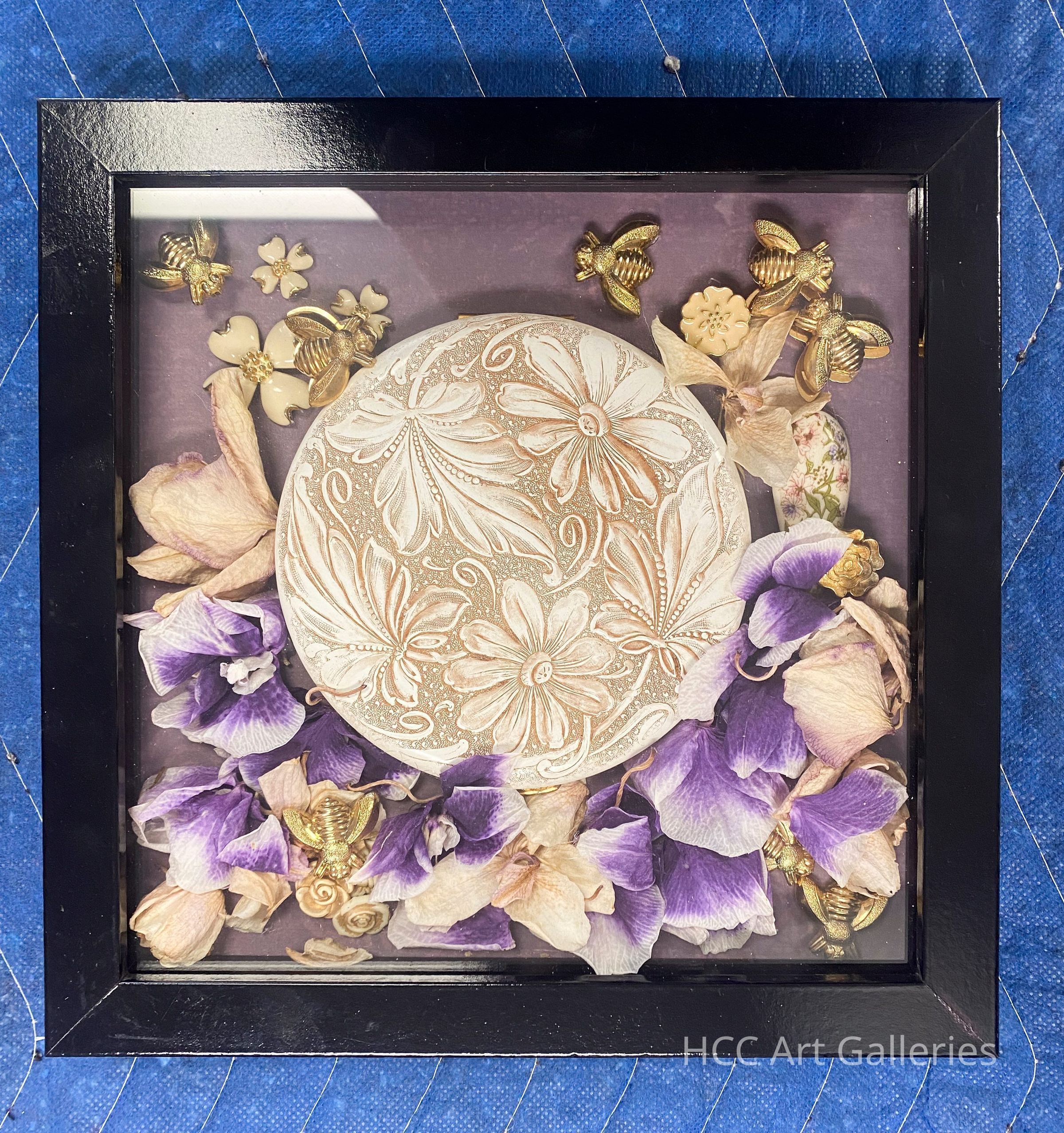 An assemblage consisting of a shadow box containing numerous objects: a compact, gold bees, dried flowers, purple paper backgroundCollection