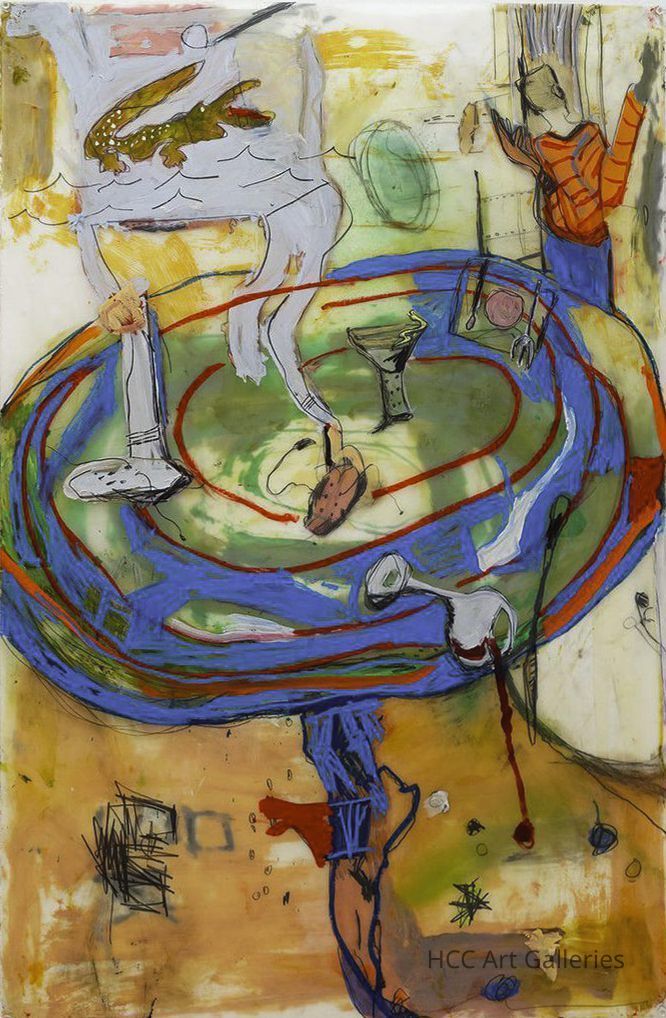 Lisa McCarthy’s studio practice utilizes the languages of painting, drawing, and sculpture to fluidly move between styles, materials, and processes. At first glance, Injury Report presents a chaotic table scene. In the lower half of the composition, a glass of wine spills off of a blue tabletop onto the floor while abstract figures dance in motion above. Layering Mylar on top of paper, McCarthy creates depth and a compelling range of color for her subjects—including an alligator, a martini glass, and a dinner plate—which come together in a scene that teeters pleasantly between celebration and mayhem.