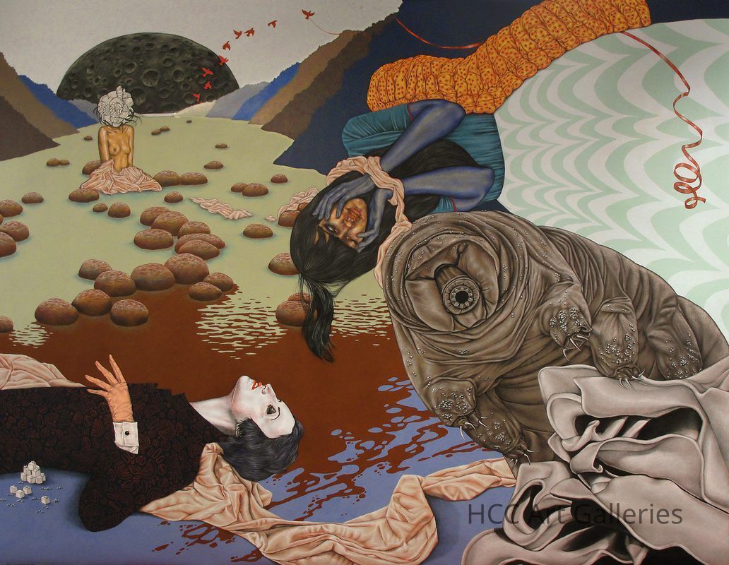 A Mixed media work on vinyl, Depicting three women (two in the foreground and one in the background,) and a Tardigrade (water bear.) There is a moon-like landform peaking over the horizon, with the silhouettes of red birds flying past the right side of it in an arc formation. There are earth-toned mountain silhouettes leading up to the moon on either side of it that decrease in size moving towards it, suggesting depth. Brown, ovaloid rocks are scattered about the piece, clustering mostly towards the foreground, and also get smaller further back into the piece. Moving forward is a half-bust of a woman with cool-toned olive skin. Her face is obscured by a flower-like image, it is in black and white similar to a coloring page; she is nude, her arms being tucked to her side and her lower half only being covered by what looks like a blanket. This light burnt orange "blanket" trails from the middle ground to the foreground. InCollection