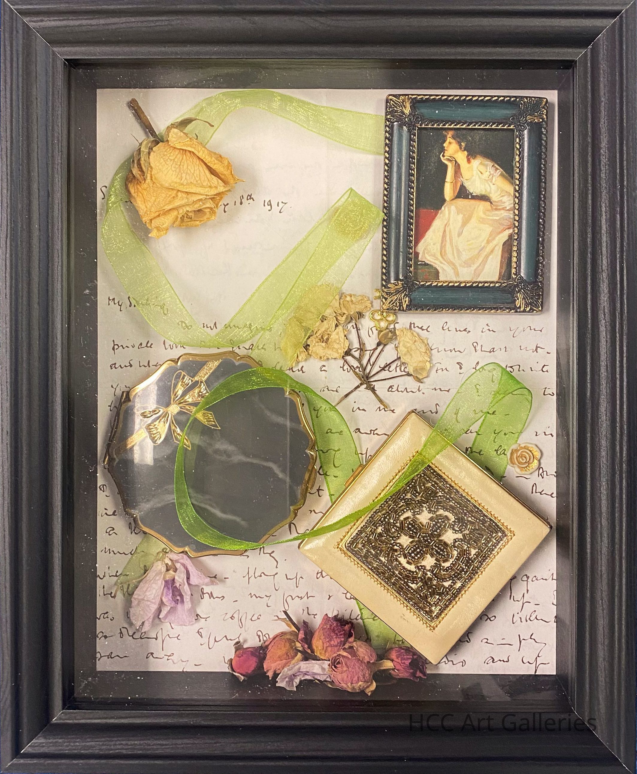 An assemblage consisting of a shadow box full of numerous objects: dried roses, compacts, a letter, a green ribbon, and a framed picutreCollection