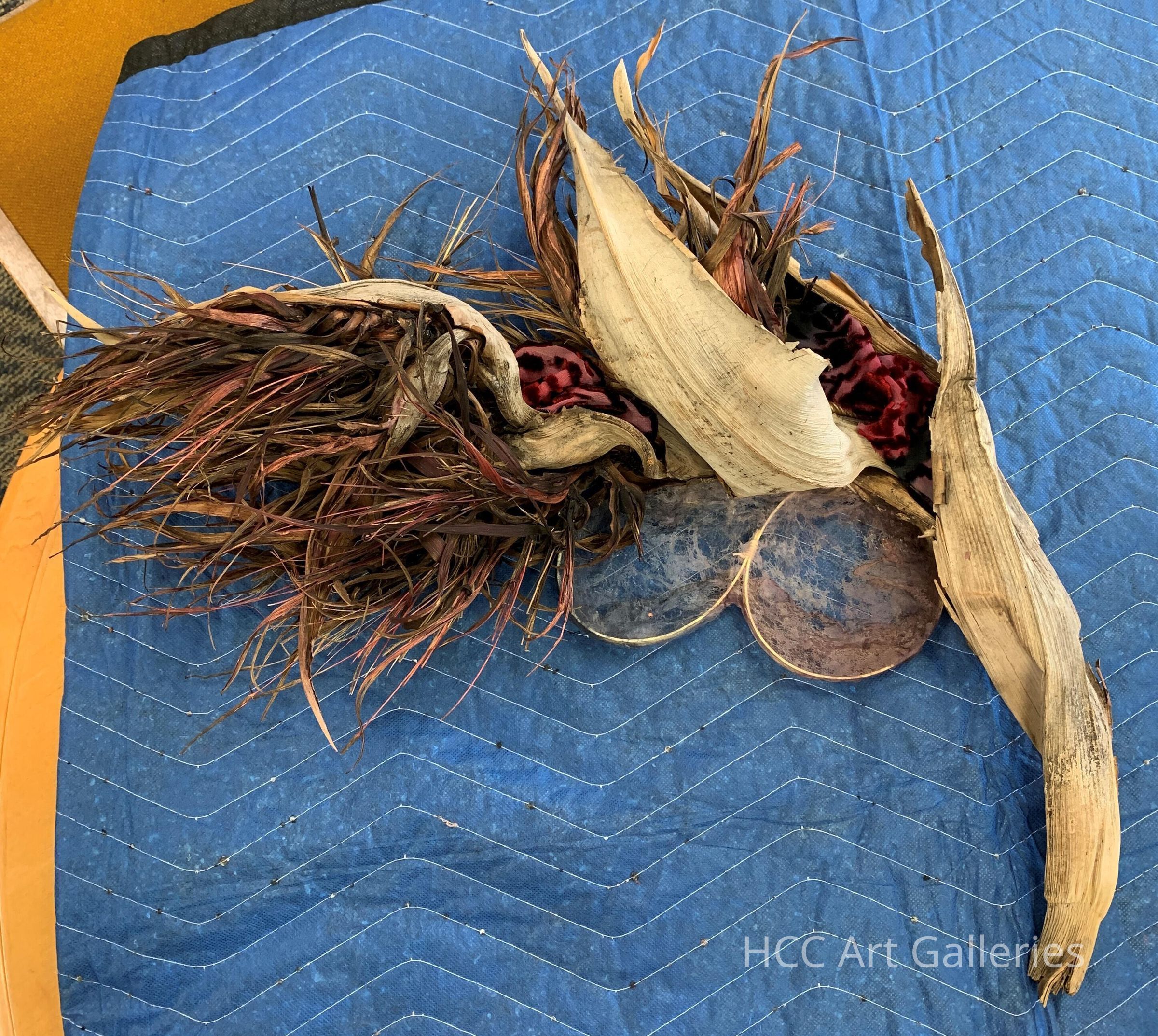 Carolyn Kossar was a Florida-based fiber artist who made weavings, tapestries and sculptures that emphasize connections between humanity and the environment, often by combining organic and man-made materials. In Paradise I, Kossar weaves together dyed maroon fabric and Carter Smith shibori on top of found organic detritus. Her practice often included the incorporation of various materials found during her walks in both Florida and New England, collecting remnants of the two places closest to her. Kossar was HCC’s Gallery Director for 20 years and was incredibly active within the Tampa community.
