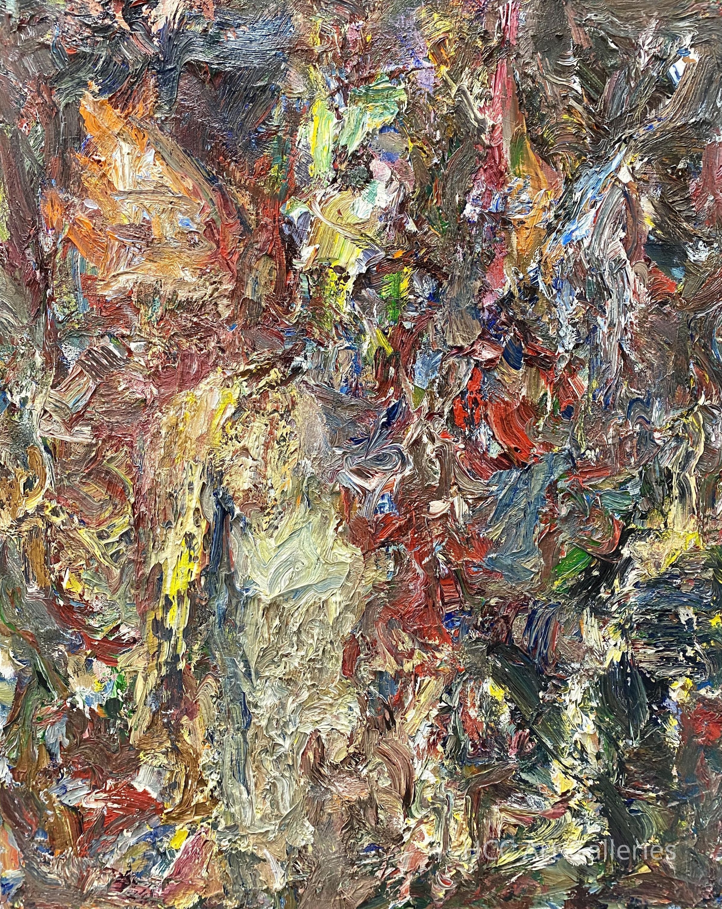 Kettner’s Portrait is a densely layered abstract painting. Brighter colors are shown centrally with darker hues surrounding the perimeter, emphasizing the separation between internal and external. The psychological dimension of Kettner’s work invites viewers to spend additional time contemplating the veiled imagery, an active exchange that the artist wrote as being necessary for the “ultimate completion” of all his abstract work. The mix of colors and brush stroke directions, forming the semblance of human structures, encourages a self-reflective observation.