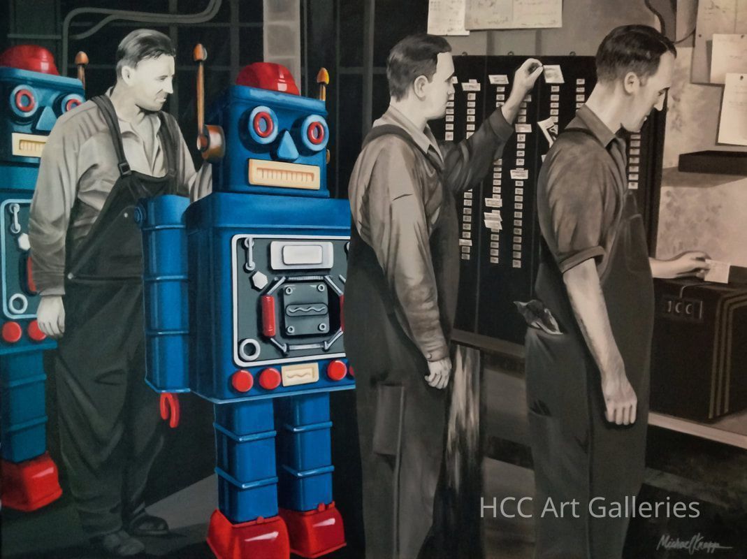 Painted in black and white, three male figures punch archaic time clocks while two robots stand in line among them in full color. The shiny red and blue robots juxtaposed with the men in workwear reminiscent of the mid 20th century, playfully suggest the morphing of man into machine over time. Through his studio practice, Knapp challenges the notion that art is just something pretty to look at, aiming to paint a social or visual statement and finding it acceptable when the viewer cultivates a story of their own.