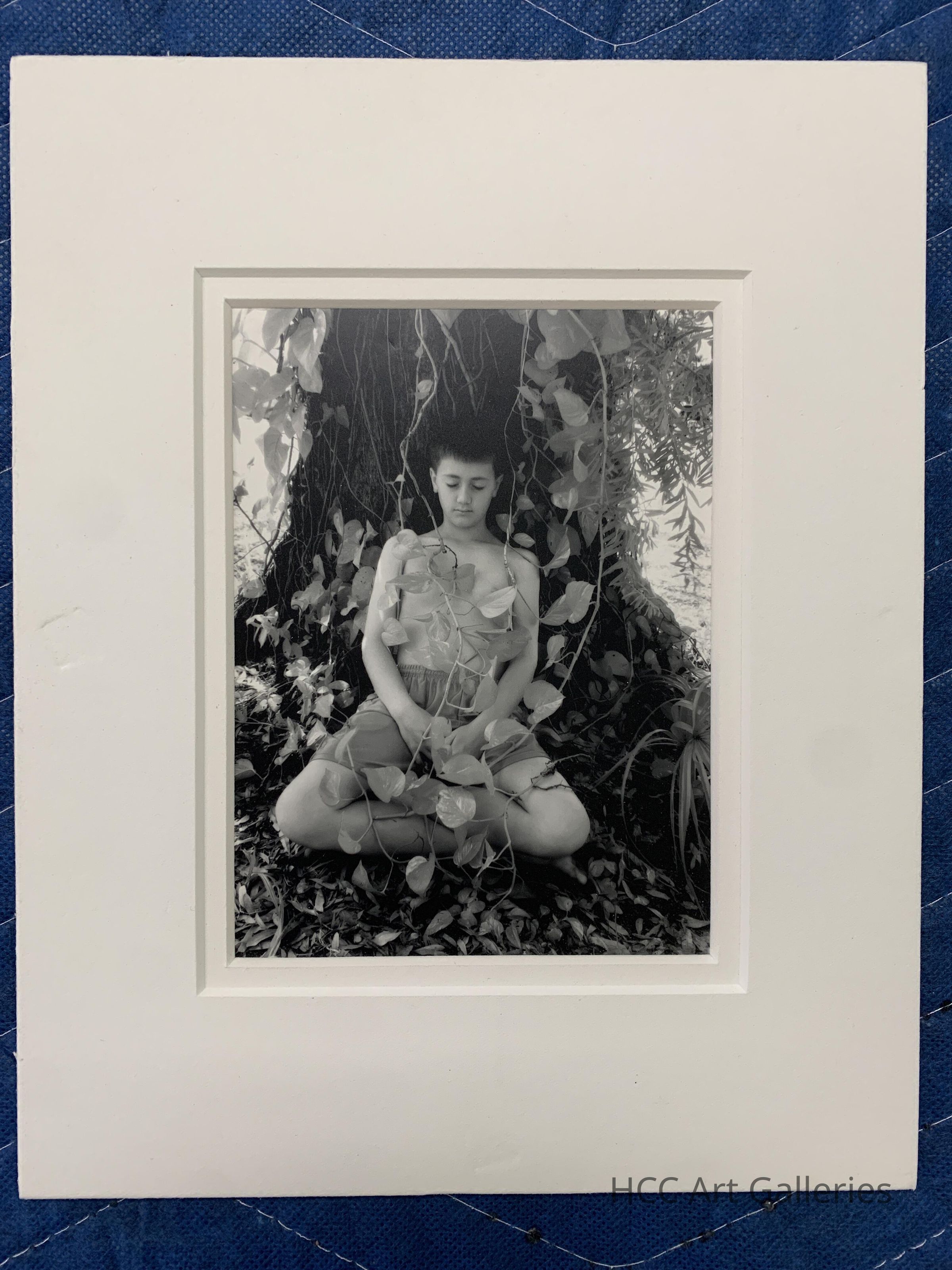 A mono-chromatic picture of a young male figure in shorts with his back to a tree. The figure has their eyes closed with vines reaching around them.Photograph Details