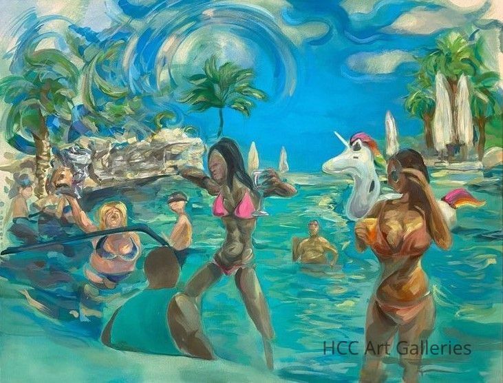 Gestural painting of a pool scene in primarily blues and greens. Figures in swimsuits in the foreground surrounded by palm trees and what appear to be poolside umbrellas. The sky swirls as clouds form in the distance.Collection